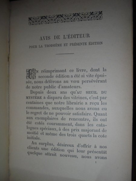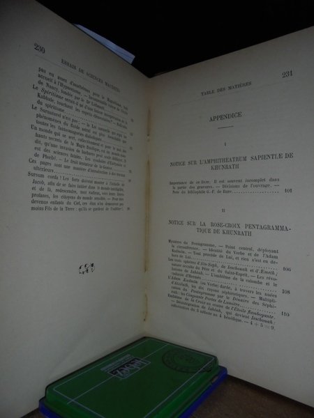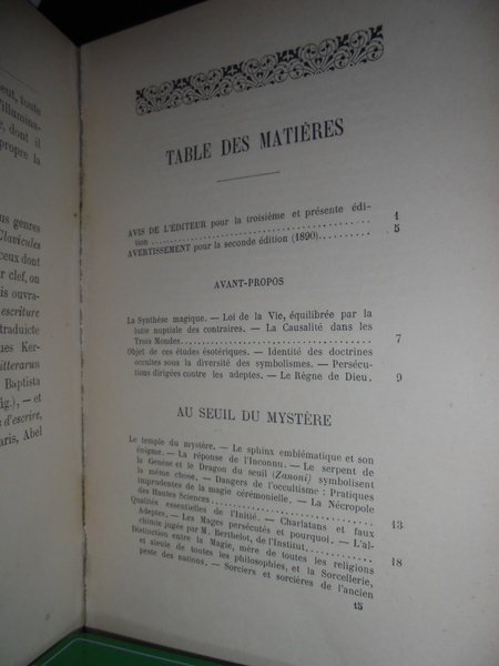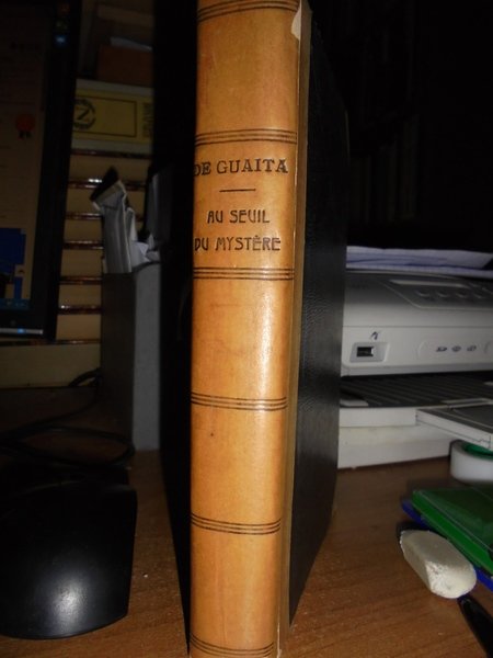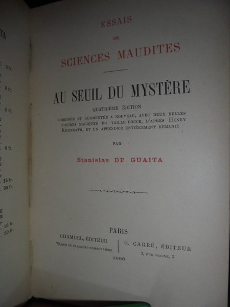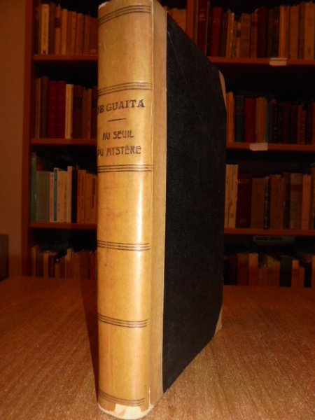 Stanislas De Guaita. Paris, Chamuel éditeur - G. Carré éditeur, 1896. ESSAIS de Sciences Maudites. Au Seuil du Mystère. Quatrième édition. Corrigée et augmentée a nouveau, avec deux belles figures magiques en taille-douce, d' après Henry Khunrath, et une appendice entièrement remanié. In-8°, m. pelle coeva con angoli. 236 pp. Bell' esemplare. Neg. Mob. nero 9
