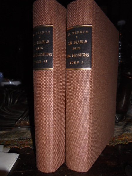 (Esoterismo) VERDUN, Paul. Paris-Lyon, Delhomme et Briguet, s.d. (1890). Le Diable dans les Missions. 2 volumi in-16°, leg. nuova in tela bruna. XX, 346 pp., 1 f. bianco; 347 pp. Caillet, 11086: << Ouvrage fort curieux.- L' onguent magique.- L' union infernale.- Fascination magique.- L' Amérique du sud.- Sorciers, magiciens.- Le Voudoux.- Culte du serpent.- L' imprégnation diabolique.- L' Amérique du sud.- Les Peaux rouges.- Bibelots magiques.- Afrique.- Médication de sorciers.- Les Indes.- Les Fakirs.- Chine.- Thibet.- Océanie.- Madagascar.- Etc. >>. Ive-Plessis, 155. Coumont, p. 500, V17.2. Neg. mens. bianca