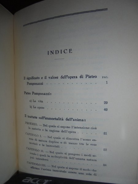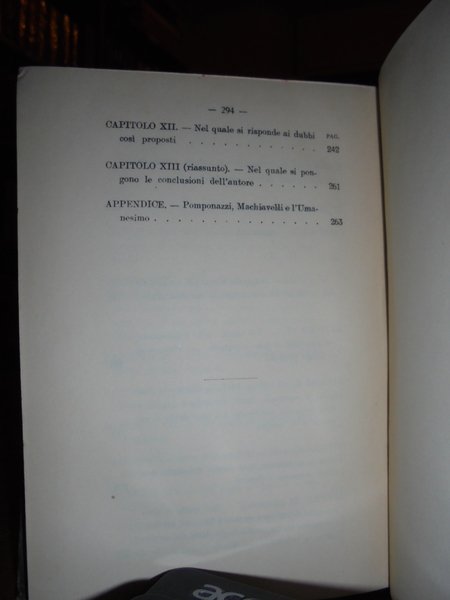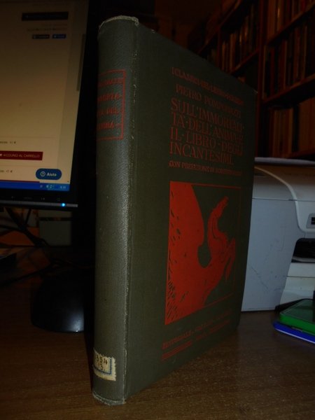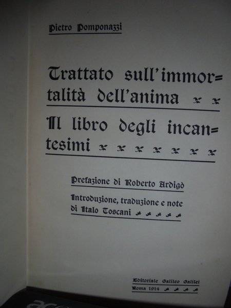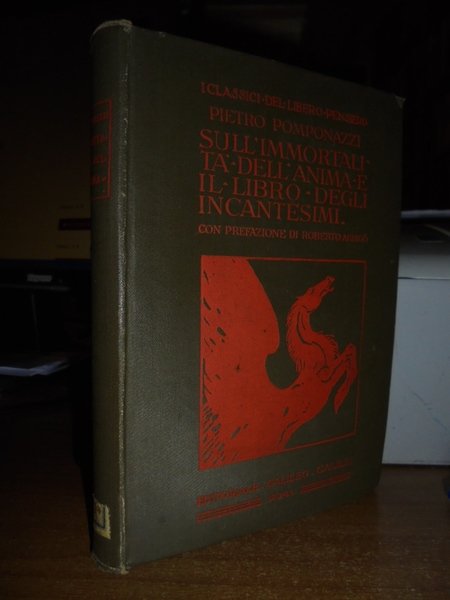 (Esoterismo) Pietro, Pomponazzi. Roma, Editoriale Galileo Galilei, 1914. Trattato sull' immortalità dell' anima. Il Libro degli incantesimi. Prefazione di Roberto Ardigò. Introduzione, traduzione e note di Italo Toscani. In-16°, cartonato nero edit. con impressioni in rosso. 294 pp. In ottimo stato di conservazione. Neg. mob. nero 9