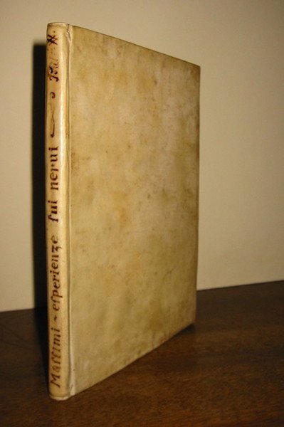 4to (cm. 22), VIII-56 pp. Fregio xilografico al frontespizio. Testatine e capilettera n.t. Legatura coeva in pergamena rigida con titolo ms. al ds. Due minuscoli fori di tarlo attraversano quasi interamente il volume, senza mai compromettere la leggibilità del testo. Pallido alone all’angolo superiore delle ultime dieci carte. Nel complesso, esemplare in ottimo stato di conservazione. Opera di grande rarità. Non in Blake. Nel libro sono minuziosamente descritti svariati esperimenti compiuti soprattutto su animali vivi o morti (cani, gatti e ranocchie) oltre che su parti anatomiche di cadaveri umani.