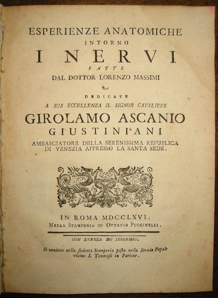 Esperienze anatomiche intorno i nervi. Dedicate a Sua Eccellenza il Signor Cavaliere Girolamo Ascanio Giustiniani Ambasciatore della Serenissima Repubblica di Venezia appresso la Santa Sede