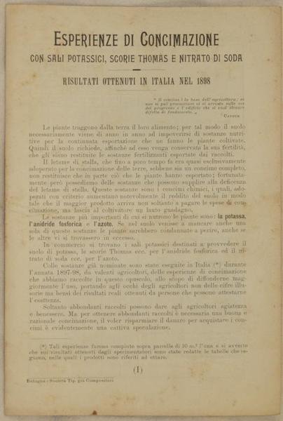 In 8. Dim. 22,5x15 cm. Pp. (12). Interessante opuscolo pubblicitario che elenca le esperienze di concimazione con sali potassici, scorie Thomas e nitrato di Soda con i risultati ottenuti in Italia e Stati Uniti nel 1898. Descrizione e lista delle persone e luogo di provenienza con risultati ottenuti A Massa Carrara, Siena, Perugia, Ascoli Piceno, Aquila, Roma, Caserta, Salerno, Catanzaro, Cagliari, Wooster (Ohio, Statio Uniti), Rison (Arkansas, Stati Uniti). Numerose foto d'epoca. In buone condizioni. Copertina assente. Legatura in buone condizioni. All'interno le pagine si presentano in buone condizioni con rare fioriture. Interesting advertising pamphlet listing experiences of fertilization with scorie Thomas and nitrato di Soda with results obtained in Italy and United States in 1898. Descritpion and list of results obtained by people in Italy and USA in Massa Carrara, Siena, Perugia, Ascoli Piceno, Aquila, Roma, Caserta, Salerno, Catanzaro, Cagliari, Wooster (Ohio, USA), Rison (Arkansas, USA). Different photoes of that time. In good conditions. Cover is missing. Binding in good conditions. Inside pages are in good conditions with occasional foxings.