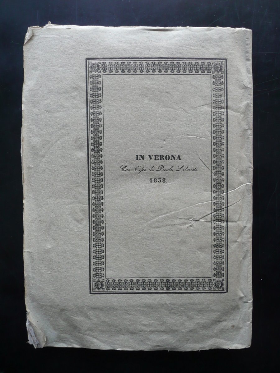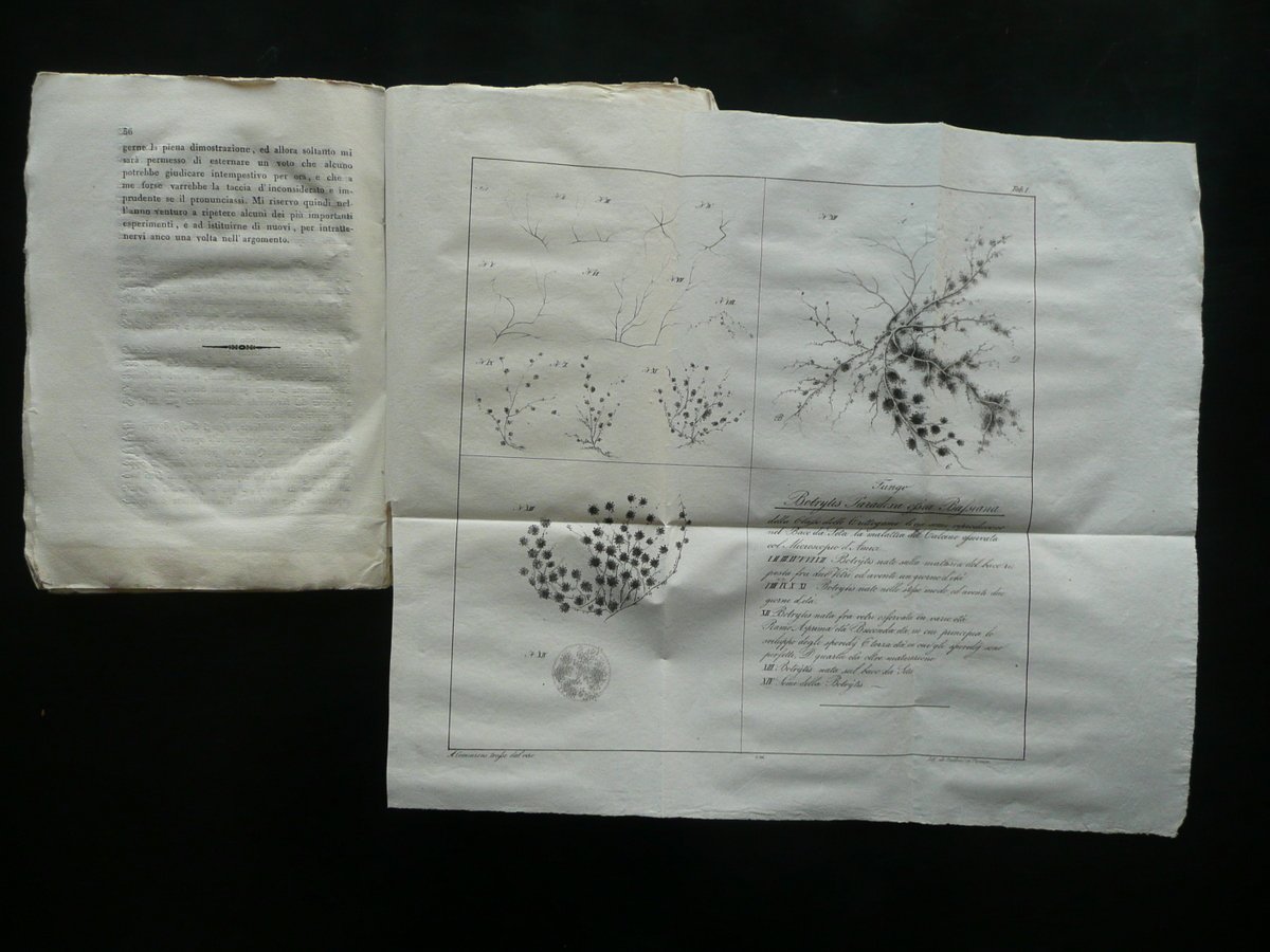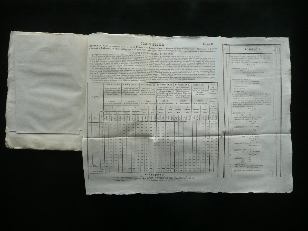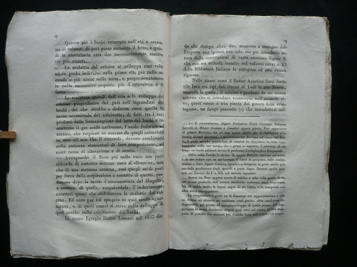 Agostino Bassi, Esperienze dirette a conoscere l'efficacia dei due metodi profilatico e curativo proposti dal Dottor Agostino Bassi di Lodi a prevenire e curare la malattia del calcino nei bachi da seta Coi Tipi di Paolo Libanti, Verona 1838, cm 22,5x16, pp. 56 con VI (6) tavole rip. pi√π volte al termine del testo (vedi foto). Brossura ed. Dedica autografa dell'Autore al margine sup. del frontespizio (firmata non col nome proprio ma l'autore"). Condizioni di conservazione Esemplare in buone condizioni con tracce d'uso; angoli delle brossure con una piccola pieghetta; margine est. della br. ant. e del frontespizio con un piccolo leggero alone (vedi foto). Interni buoni; margini con barbe; margine inf. delle pp. 9-10 con qualche piccolo strappetto che non interessa il testo; tavola V con qualche pieghetta al margine sup. Con sei tavole ripiegate pi√π volte al termine del testo, di cui varie con prospetti (vedi foto). SETT92.L8474 N "