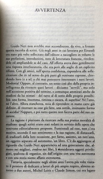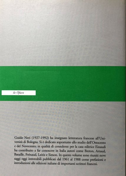 Guido Neri, scomparso da pochi anni, è stato un noto ed apprezzato francesista. Ha insegnato letteratura francese all'Università di Bologna ed ha svolto a lungo il ruolo di consulente per la casa editrice Einaudi; grazie a questo incarico è riuscito di far conoscere in Italia autori come Bataille, Artaud, Breton e molti altri.