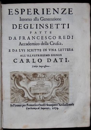 Esperienze Intorno alla Generazione deglInsetti fatte da Francesco Redi, Accademico della Crusca, e da lui scritte in una lettera allIllustrissimo Signor Carlo Dati. Terza Impressione.