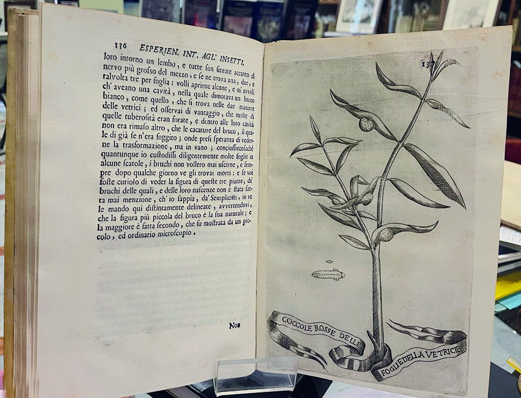 . (Entomologia-Fig. del ’600) REDI Francesco. Esperienze intorno alla Generazione degl’insetti fatte da F.R. Gentiluomo Aretino, e Accademico della Crusca. E da Lui scritte in una Lettera all’illustrissimo Signor Carlo Dati...Firenze, Matini, 1688. In-4°, leg. p. perg. con tit. in oro al d. su tass.; pp. (2)-177 con 2 figg. inc. n.t. e 39 splendide tavole a piena pagina di cui 10 comprese nella numerazione e 29 fuori testo, poste alla fine del volume raffiguranti gli insetti (ingranditi). Front. in rosso e nero con vignetta incisa con il motto dell’Accademia della Crusca e alla prima c. proverbio “Chi fa esperienze accresce il sapere; chi è credulo aumenta l’errore”. Fresco esemplare perfetto completo della rara tavola ripiegata che raffigura la zanzara. Antica nota di appartenenza manoscritta.