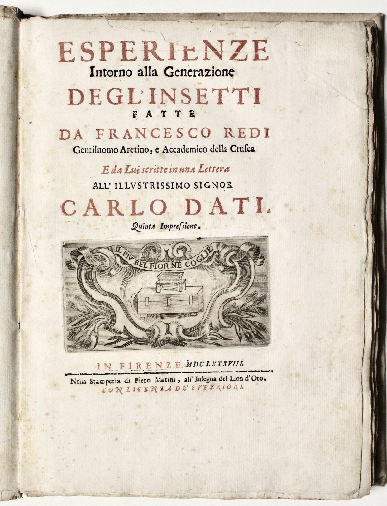 In 4° (mm 256x190); occhietto, (4), 177 con 29 tavole f.t. incise con finezza in rame poste alla fine del tomo, più altre 10 tavv. a piena pagg. e 2 figure intercalate nel testo, raffiguranti insetti ingranditi più voltecompleto della tavola della zanzara. Capilettera istoriate entro belle vignette silografiche e testatine in legno. Frontespizio in rosso e nero con il motto dell'accademia della crusca in rame. Testo in volgare, alcune citazioni stampate in lingua araba ed in latino e greco. <BR>Cartone muto d'attesa con titolo su etichetta al dorso. <BR><BR>Questo fu il capolavoro letterario di Francesco Redi, famoso letterato e scienziato a cavallo del XVII secolo; fu al servizio dei Medici, con i quali sembra essere stato uno dei promotori dell'Accademia del Cimento; egli mette comunque da parte superstizioni e dicerie e porta il suo lavoro sul piano della sperimentazione razionale e sensista, scindendo, per quanto possibile la scienza dalla morale cattolica e dai princìpi religiosi. Opera assai importante per la storia delle scoperte sui parassiti, si fonda oltre che su ingegnose prove sperimentali, su ripetute osservazioni microscopiche. <BR>Ottimo esemplare genuino in barbe stampato su carta forte ad ampi margini. Margine sup. del frontespizio con mancanza. Garrison-Morton 97: "Redi's experiments [.] dealt the first real blow to the doctrine of spontaneous generation. In these experiments Redi made use of what we now term "controls"; Piantanida 1749: "Pur essendo la tiratura delle tav. più stanca, l'autore riconobbe questa quinta edizione, quanto al testo, migliore della prima"<BR>Prandi 11. Gamba 815. Brunet IV,1175. (per la prima edizione del 1668) Graesse VI, I, pag. 58; Prandi,11.<BR>