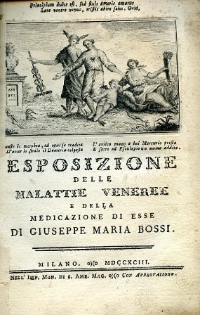 In-8° (208x135mm), pp. 303, XV (non è presente la prima c. bianca precedente l'indice), cartonatura ottocentesca muta. Al frontespizio, vignetta calcografica con figurazione allegorica; nella scena Mercurio conduce con sé un uomo affetto da una malattia venerea: 'Guaste le membra, ed ogni fe tradita / D'amor lo strale il Damerin calpesta / L'amica mano a lui Mercurio presta / E sacro ad Esculapio un nume addita'. Testatine figurate e fregi tipografici incisi su rame. 2 tavv. sempre incise su rame ripiegate f.t. in fine. Buon esemplare con sparse fioriture. Prima e unica edizione, molto rara, di questo settecentesco trattato di veneorologia. Il Bossi, medico e chirurgo milanese, compose anche una dissertazione sull'Uso pratico del mercurio nelle malattie veneree con una dissertazione su la somiglianza dei fiori bianchi colla gonorrea nelle donne. Wellcome, II, p. 208. Manca al Blake.