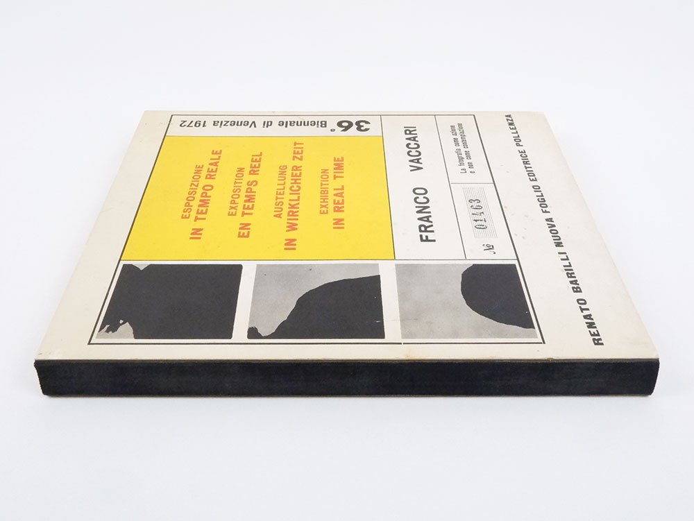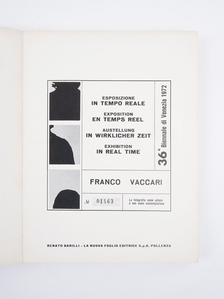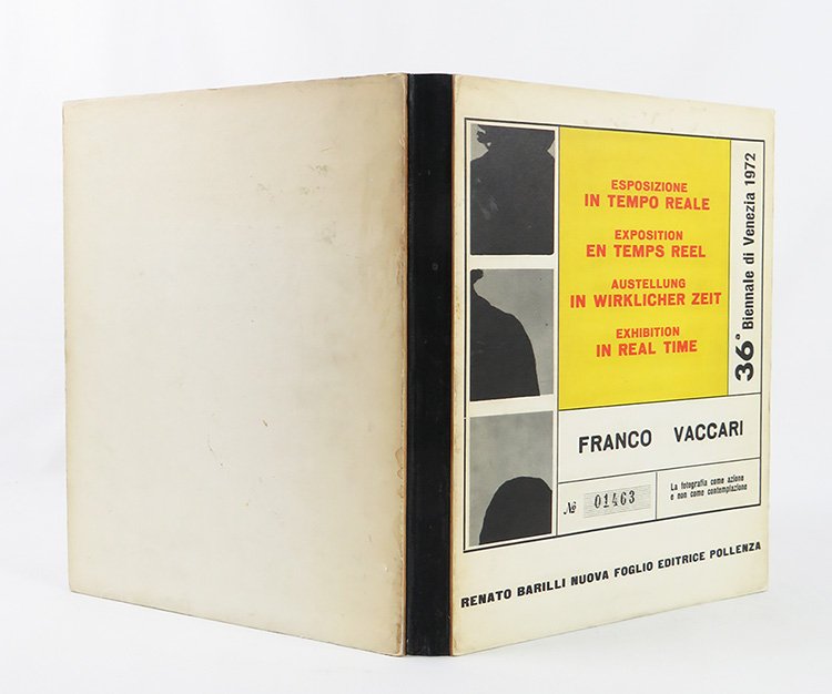 LIBROEdizione originale.Ottimo esemplare (minimi lievi segni del tempo, piccole gore e fioriture, sui piatti; interno eccellente, senza bruniture o ingialliture): condizione assai rara per questo libro, fragile alla legatura e estremamente soggetto all’invecchiamento della carta. L’originario possessore dell’esemplare ha voluto lasciare personalmente “traccia del proprio passaggi” interfoliando una tessera autoscatto applicata con graffetta rimovibile alla testa di una delle pagine.Tirato in sole 500 copie e ormai divenuto molto raro, «Esposizione in tempo reale» è un eccezionale documento della ricerca di Franco Vaccari tesa, fin dagli esordi come poeta verbovisuale nella seconda metà degli anni sessanta, a decostruire e ridefinire il significato dell’oggetto artistico e il ruolo del fruitore rispetto all’opera. Con il ciclo delle “esposizioni in tempo reale”, avviato nel 1969, Vaccari ha realizzato il suo ideale di partecipazione diretta dello spettatore nel processo creativo, nonché la sua personale via alla messa in scena artistica come momento non predeterminato e aperto alla trasformazione. -- Alla Biennale di Venezia del 1972 Vaccari installò una cabina Photomatic all’interno di una sala dove campeggiva lo slogan «Lascia su queste pareti una traccia fotografica del tuo passaggio», tradotto anche in inglese, francese e tedesco: dietro la tenda della Photomatic, i visitatori della kermesse si sbizzarrirono, applicando poi le strisce con gli autoscatti sulla parete preposta. Lietta Tornbuoni raccontava, sulla «Stampa» del 31 agosto 1972: «Il vero grande successo di pubblico, alla Biennale rivisitata, resta però la sala in cui Franco Vaccari ha sistemato la garitta di un photomat accompagnata dall’invito “Lascia su queste pareti una traccia fotografica del tuo passaggio”. […] mentre la sala di Morlotti è disertata, davanti alle pareti su cui sono appiccicate le “tracce fotografiche”, si addensano senza tristezza o noia, folti gruppi di osservatori appassionati. Le piccole strisce di autofotografie mostrano sorrisi, sberleffi, anatemi fisiognomici, sederi nudi, pugni chiusi. […]. Davanti alla parete la gente, attenta, divertita, incantata, non si stanca di contemplare sé stessa». -- Il libro monumentale della Nuova Foglio, prefato da Renato Barilli, nelle sue oltre centocinquanta pagine documenta minuziosamente la performance, con immagini dell’allestimento e dello svolgimento, e la riproduzione delle migliaia di strisce fotografiche degli autoscatti, ponendosi come principale documento artistico di quell’evento eccezionale e irripetibile.Bibl. I libri di Franco Vaccari (In forma di libro n. 3, Modena 2000), pp. 29-31; Parr & Badger, The Photobook vol. 3, p. 286