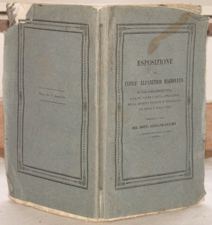 In 8. Dim. 24,5x16 cm. Pp. 2 (n.n.)+192. Interessante e rara opera completa in un volume, l'elenco ragionato degli elementi per una facile applicazione della sovrana patente del 27 Gennaio 1840 sul bollo e le tasse. Opera scritta da Gustavo Kluchy, finanziere della Lombardia. In buone condizioni. Brossura editoriale in ottime condizioni generali con lievi usure ai margini e dorso. Legatura in ottime condizioni. All'interno le pagine si presentano in buone condizioni con rare fioriture ma macchie di inchiostro ai tagli ed al margine destro di alcune pagine. Interesting and scarce complete work in one volume, the reasoned list of the elements for an easy application of the sovrana patente of the 27 of January about taxes. Work written by Gustavo Kluchy, finance guard of the Lombardia. In good conditions. Editorial cover in very good general conditions slightly worn in the edges and spine. Binding in very good conditions. Inside pages are in good conditions with occasional foxings but some ink's stains in the external edges and the right edge of pages.