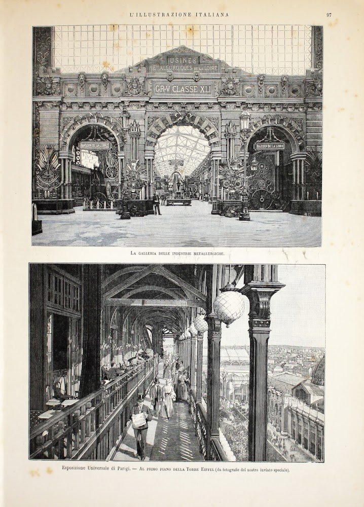 Esposizione Universale di Parigi. Industrie metallurgiche; Primo piano della tour Eiffel. Stampa 1889