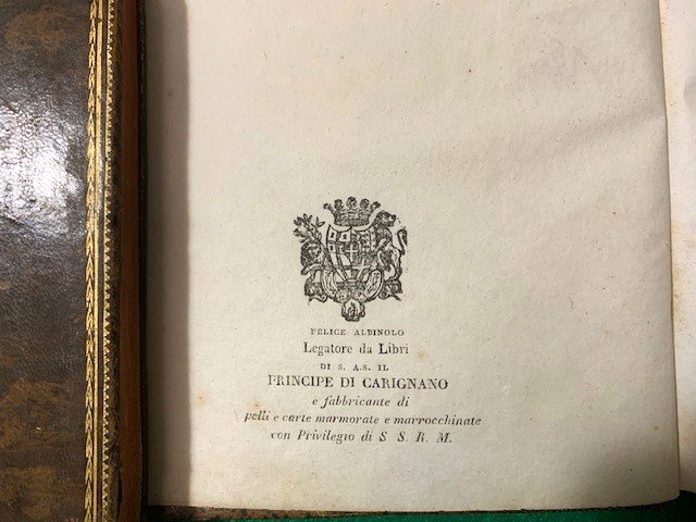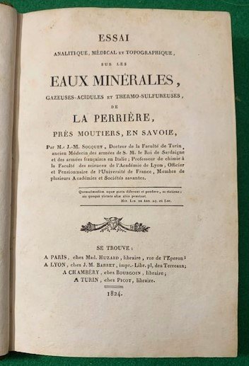 In 8°; (2 b.), (8), 301, (3), 9, 2, (1 b.) pp. e una grande c. di tav. più volte ripiegata. Dedica de La de la Societé des bains de Perriere al Marchese Giovanni Antonio Raggi, Ministro delle finanze di Sua Maestà il Carlo Alberto di Savoia. Bellissima legatura coeva in piena pelle maculata con titolo e anno in oro su fascetta in oro al dorso realizzata da Felice Albinolo legatore di libri di S. A. S. il Principe di Carignano come da bel timbro alla prima carta bianca che presenta un cartiglio con la descrizione dei suoi lavori sotto allo stemma raldico del Principe di Carignano. Ricche cornici in oro al dorso. Piatti interni in bella carta marmorizzata. Felice Albinolo, oltre ad abile legatore fu anche fabbricante di pelli e carte marmorate e marocchinate con Privilegio di S. S. R. M. . Tagli spruzzati. Esemplare in ottime condizioni di conservazione ed in bella legatura coeva artigianale. Prima edizione di questo celebre scritto mineralogico dedicato alle qualità minerali e mediche delle acque di Perriere in Savoia, opera del celebre medico e professore di chimica industriale di Lione, Joseph-Marie Socquet (1771 - 1839) che fu dal 1803 membro dell'Accademia delle Scienze di Torino. Nel cuore delle Alpi francesi, tra paesaggi mozzafiato e un'aria fresca e pura, si trova la pittoresca città di Moûtiers, rinomata non solo per la sua bellezza naturale, ma anche per le sue preziose risorse idriche. Le acque minerali di Moûtiers rappresentano un vero tesoro per la regione, con una storia ricca di tradizione e una qualità che le rende apprezzate in tutto il mondo. La storia delle acque minerali di Moûtiers affonda le radici nei tempi antichi, quando i popoli locali hanno scoperto le proprietà curative e rivitalizzanti delle sorgenti naturali presenti nella zona. Sin dall'epoca romana, queste acque hanno attratto visitatori in cerca di salute e benessere, contribuendo alla reputazione di Moûtiers come luogo di guarigione e rigenerazione. Uno dei fattori che rende uniche le acque minerali di Moûtiers è la loro composizione unica. Queste preziose risorse sono ricche di minerali essenziali per il corpo umano, tra cui calcio, magnesio e potassio. Grazie a questa composizione equilibrata, le acque di Moûtiers offrono numerosi benefici per la salute, aiutando a rafforzare le ossa, migliorare la digestione e favorire il benessere generale. Ma non è solo la composizione minerale che rende le acque di Moûtiers così speciali. La purezza delle sorgenti è un elemento fondamentale della loro qualità. Situate in ambienti incontaminati e protette da un rigoroso controllo di qualità, queste acque sono note per la loro freschezza e pulizia, garantendo un gusto naturale e delizioso che conquista i palati di chiunque le assaggi. La reputazione delle acque minerali di Moûtiers si è diffusa ben oltre i confini della Francia, con molti appassionati di acqua minerale che cercano specificamente questo marchio per le sue eccezionali proprietà e il suo gusto distintivo. Gli estimatori apprezzano non solo il sapore delle acque di Moûtiers, ma anche il loro impatto positivo sulla salute e sul benessere. Oltre ad essere consumate come bevanda, le acque minerali di Moûtiers sono spesso impiegate anche in trattamenti termali e cure mediche, sfruttando le loro proprietà curative per alleviare una varietà di disturbi fisici e promuovere il rilassamento e il benessere psicologico. In conclusione, le acque minerali di Moûtiers rappresentano un connubio straordinario tra storia, purezza e qualità. Con una composizione minerale equilibrata e una freschezza ineguagliabile, queste sorgenti sono un vero gioiello della natura, offrendo benefici per la salute e il benessere che continuano a conquistare il cuore e il palato di chiunque abbia il privilegio di assaggiarle. Moûtiers rimane così non solo un luogo di bellezza naturale, ma anche una fonte di vitalità e rigenerazione per coloro che cercano la perfezione nelle acque minerali. Prima edizione in ottime condizioni in legatura artigianale coeva firmata dall'artigiano che l'ha realizzata.
