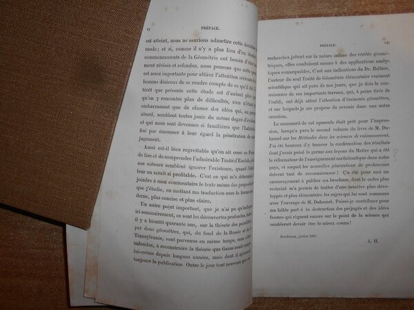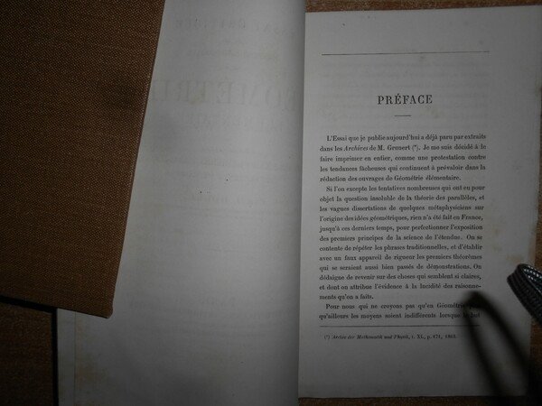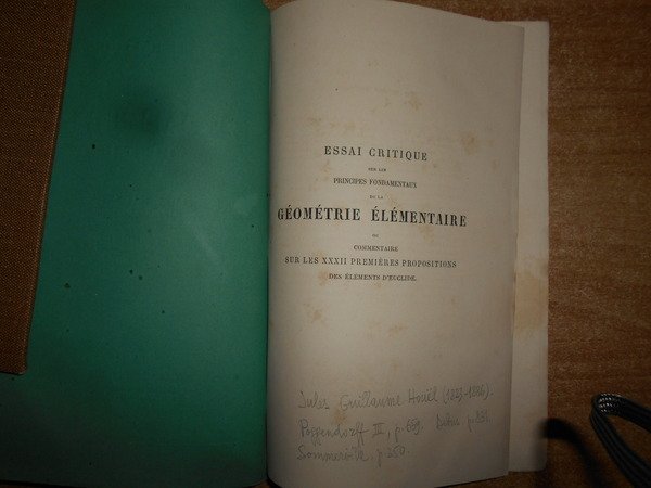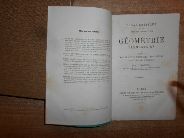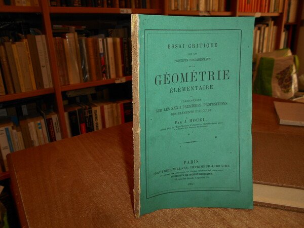 Jules Guillaume Hoüel (1823-1886). Paris, Gauthier Villars, 1867. Essai critique sur les principes fondamentaux de la géométrie élémentaire, ou commentaire sur les XXXII premières propositions des éléments d'Euclide. In-8°, br. orig. vii, 85, (1) pp. con numerose figure nel testo. Poggendorff, III, p. 659. Debus, p. 831. Sommerville, p. 350. Dorso sdrucito ma ben legato, cucito e ben conservato. Neg. scat. 3 opusc. nonn. parav.