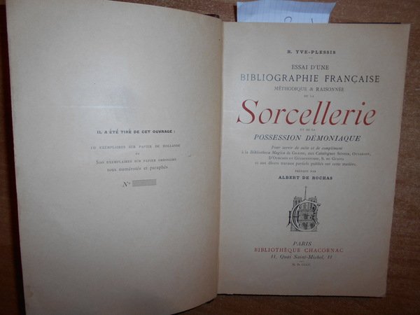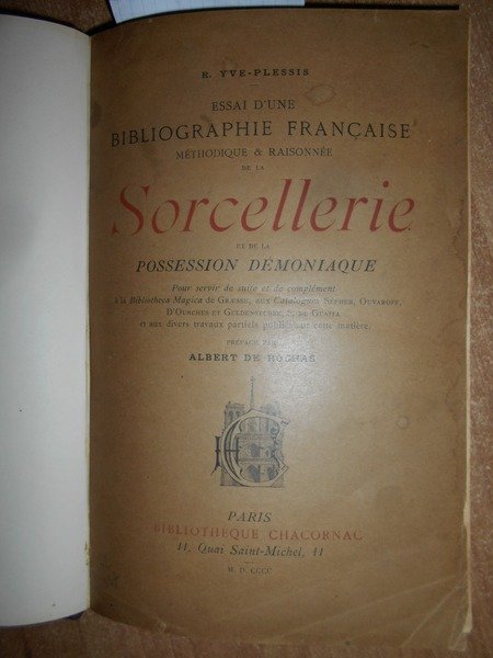 R. YVE-PLESSIS. Paris, Bibliothèque Chacornac, 1900. ESSAI D' UNE BIBLIOGRAPHIE Française Méthodique & Raisonnée de la SORCELLERIE et de la Possession Démoniaque pou servir de suite et de complément à la Bibliotheca Magica de Graesse, aux Catalogues Sépher, Ouvaroff D' Ourches et Guldenstubbe, S. de Guaita. In-8°, bella e pregiata legatura in m. marocchino con grandi angoli, dorso a nervi con titolo in oro, copertine originali conservate. xiv, 254, (1) pp. Bellissimo esemplare dell' edizione originale a tiratura limitata con le copertine originali conservate impreziosito dalla firma dell' Autore come Hommage de l' Auteur. Uff. D- III - 2