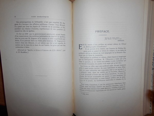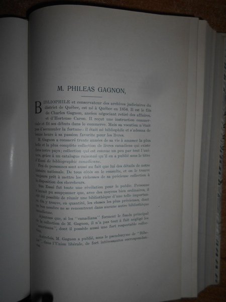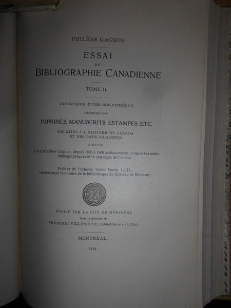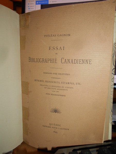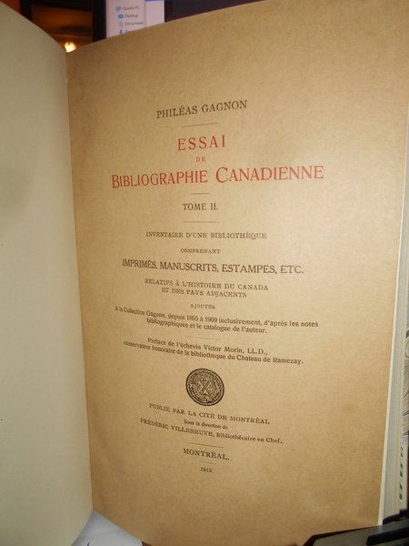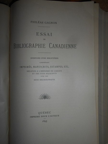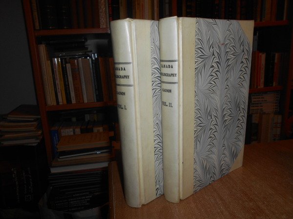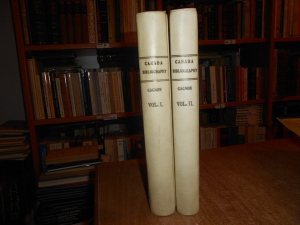 Gagnon, Philéas. par L'Auteur, Montréal, 1895. Essai de bibliographie canadienne. Inventaire d'une bibliothèque comprenant imprimés, manuscrits, estampes, etc. relatifs à l'Histoire du Canada et des pays adjacents avec des notes bibliographiques. Edizione originale. 2 volumi in-8°, m. pergamena con larghe punte, titoli in nero ai dorsi, copertine originali conservate. I. (iv), x, 711 pp.; II. (iv), xi, (iii), 462 pp., ritratto dell' autore fuori testo. Opera completa. Uff. B - I - 6 - 2