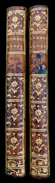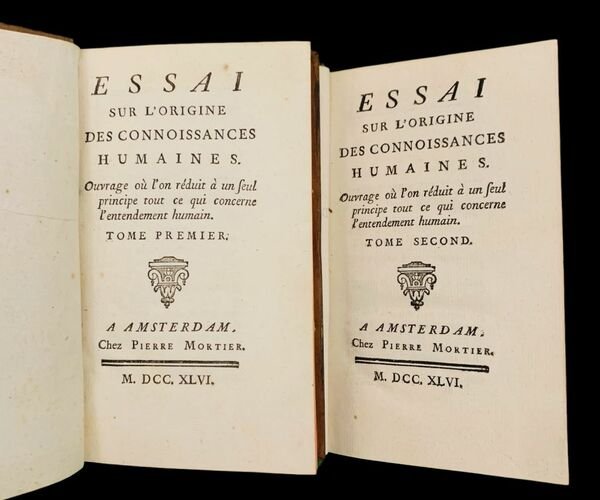 In 8° (16,5x9 cm); due tomi: (2 b.), XXIV, 265, (3 b.) pp. e (2 b.), (4), 292 pp. Belle legature coeve in piena pelle maculata con titolo, numeri del volume e ricchi fregi in oro al dorso (nel volume primo il numero del tomo è a secco e non in oro). Tagli rossi. Segnalibro in seta verde in tutte e due i volumi. Filetti in oro ai tagli dei piatti. Piatti interni foderati con bellissima carta marmorizzata coeva. Esemplare in ottime condizioni di conservazione. Seconda edizione, identica alla prima edizione dello stesso anno dalla quale si distingue solo per il numero delle pagine dell'introduzione, XXIV invece di XXX, di una delle opere principali dell'illuminismo scritta dal celebre filosofo, enciclopedista ed economista francese, Étienne Bonnot de Condillac (Grenoble, 30 settembre 1714 Beaugency, 3 agosto 1780) Contemporaneo di Adam Smith e di idee liberali nonostante la sua appartenenza al clero, fu tra i massimi esponenti del Sensimo e diede un grande contributo anche alla psicologia e alla gnoseologia per i suoi studi incentrati sulla comprensione dei sistemi di pensiero della mente umana. Tutore del piccolo duca di Parma, rimasto orfano a soli 7 anni nel 1758 su scelta diretta della corte francese, fu amico di Diderot e Rousseau e nonostante l'amicizia con i filosofi enciclopedisti malvisti dalle autorità ecclesiastiche, riuscì sempre a mantenere buoni rapporti con tutti grazie alla sua innata capacità di mediazione ed al suo carattere amabile. Sulla scorta del lavoro di Locke dimostrò grandi doti di chiarezza espositiva nella descrizione delle sue idee sul funzionamento del sensimo empirico. L'Essai sur lorigine des connaissances humaines, fu la sua prima opera pubblicata e gli diede, da subito, un'enorme fama e l'apprezzamento di diversi esponenti di punta dell'Illuminismo, primo fra tutti da Voltaire. Intento del primo Essai era di «ridurre a un medesimo principio» il sensismo lockiano. Tale esigenza metodologica è svolta da C. colmando il distacco, da Locke postulato e non giustificato, tra le idee sensibili dirette e quelle riflesse: lo sviluppo dei modi di comunicare emozioni e sensazioni, luso dei segni linguistici cui è dedicata la parte più originale dellEssai ristabilisce appunto la continuità genetica tra la pura sensazione e le più complesse operazioni intellettuali da Treccani. L'esemplare da noi presentato è lin bella legatura coeva ed in eccellenti condizioni di conservazione. Good copy. Rif. Bibl. per la prima e seconda edizione: Cioranescu, 20327; Barbier II, 235 ; Quérard II, 267 ; Tchemerzine III, 474.
