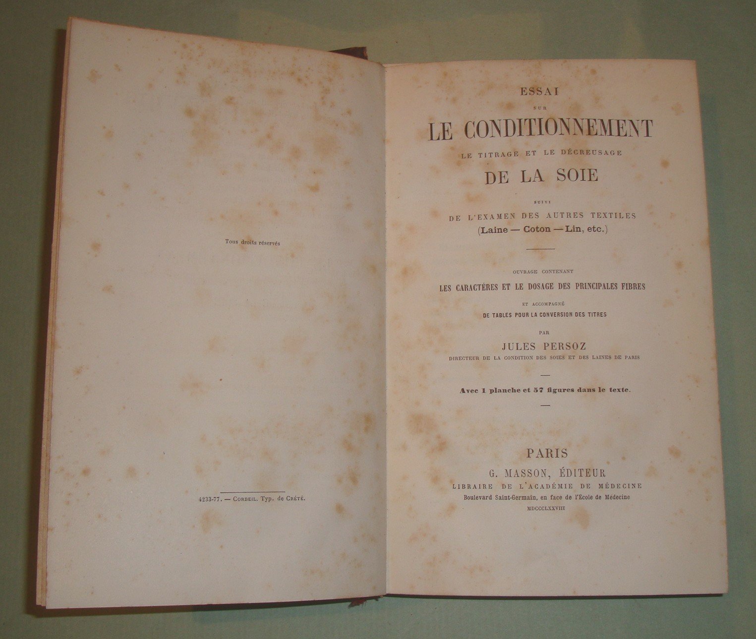 Essai sur le conditionnement, le titrage et le décreusage de la soie suivi de l’examen des autres textiles: laine, coton, lin etc.