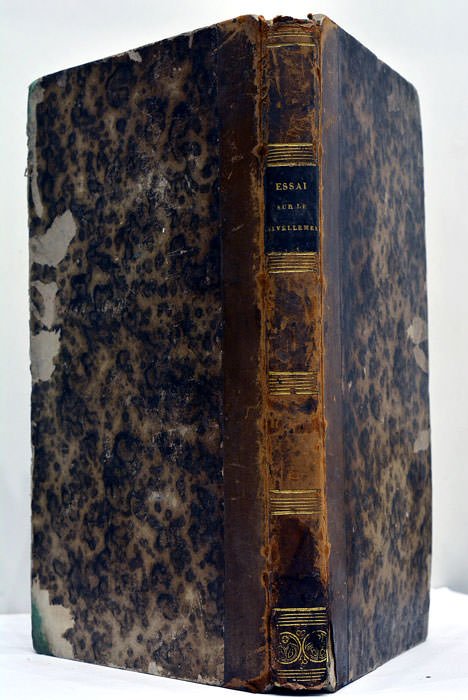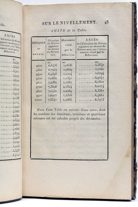 2 feuillets. 218 pages. (21x13 Cm). Demi veau. Dos lisse orné. Coins et coiffes émoussés. Petits manques. Charnières frottées. Pierre Busson-Descars, ingénieur français, donne dans cet ouvrage la description de tous les niveaux utilisés à l’époque : Niveau à Eau, Niveau à Bulle et à Lunette de Chezy, Niveau à Bulle d’Air et à deux Lunettes, Clitomètres ou Niveaux de pente, nouveau Niveau à Eau de Michelotti, entre autres. 9 planches dépliantes hors texte finement exécutées, représentant pour la plupart des instruments. Taches et rousseurs éparses. Travail de vers en bas de la planche nº 5. Mouillures. Bon exemplaire.