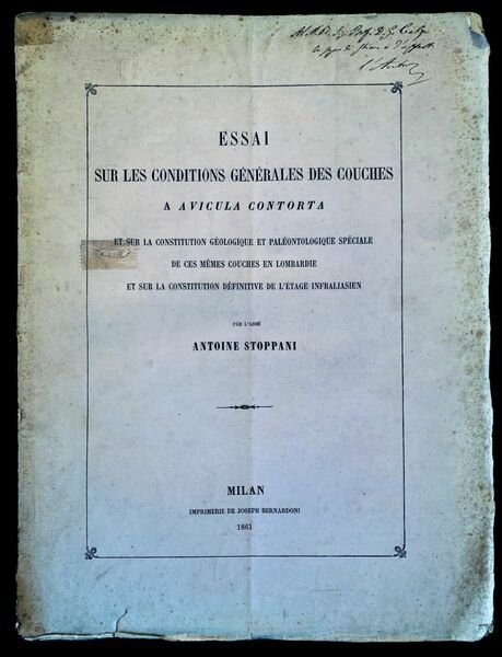 Essai sur les conditions générales des couches a avicula contorta et sur la constitution géologique et paléontologique speciale de ces memes couches en Lombardie et sur la constitution definitive de letage infraliasien par labbé Antoine Stoppani.