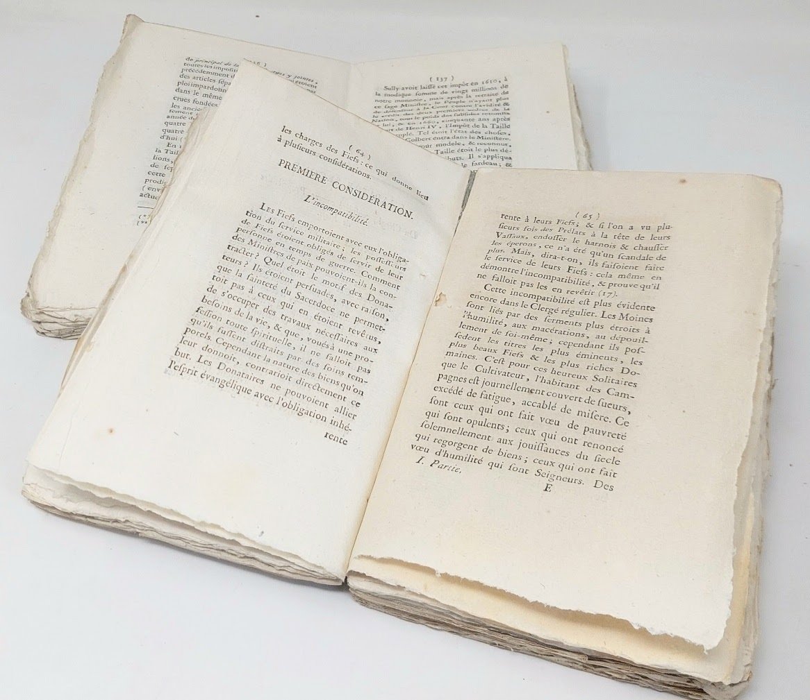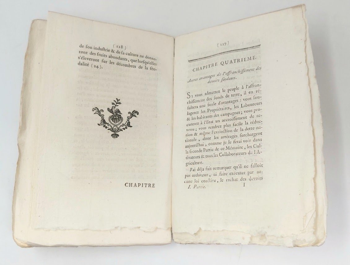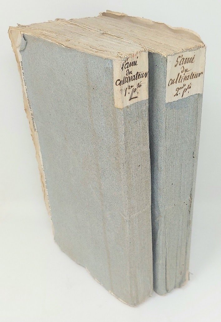 >2 vol. in-8, pp. XXII, 141, (3), 88; (4), 291, (1), 27, (1), IV (Table des Chapitres), (2, Errata), brochure originale in carta azzurrina muta, titolo su tasselli in carta al dorso (minimi segni di usura). Al primo vol. bell'antiporta inciso raffigurante Blanche, madre di Saint Louis, in atto caritatevole (descrizione dell'evento nelle Note a p. 29) ; testate e finalini xilografati nel testo. Seconda edizione accresciuta (la prima edizione apparsa nello stesso anno a Parigi consta di sole 262 pagine e reca il titolo "Mémoire sur les moyens d'améliorer...") dell'opera del celebre economista francese (1793-1796), ispettore generale del commercio. L'enorme successo della prima edizione portò alla rapida ristampa del testo e alla realizzazione di una veste grafica di maggiore lusso (si veda ad esempio l'aggiunta di un antiporta figurato). L'occhietto riporta inoltre il titolo "L'Ami du Coltivateur", evidente richiamo al titolo dell'opera di Mirabeau "L'Ami des Hommes". L'autore dichiara falsamente postuma l'opera ad indicare che la riteneva una sorta di suo testamento politico: importante documento sulla difficile situazione socio-economica delle campagne francesi alla fine del Settecento e soprattutto alla vigilia della rivoluzione francese, che ritiene sia "conséquence des droits fèodaux et des droits ecclésiastiques...Moyen pour en atténuer ou supprimer les effets, et divers remèdes secondaires: une plus juste réparation des impôts, l'étabilissement de filatuers à la campagne, ..." (INED). Ottimo esemplare, intonso e ad a margini interi disuguali. Vroil, Étude sur Clicquot-Blervache, économiste du XVIIIe siècle, p. 278. Weulersse I, p. xxxi. Einaudi 1136. Leblanc, De Thomas More à Chaptal, contribution bibliographique à l'histoire économique, 117. INED 1138. non in Kress né in Goldsmiths.