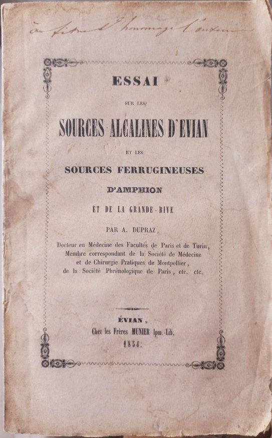 >In-8, pp. 116, brochure editoriale a stampa con titolo entro elegante bordura al piatto superiore, con nota dell'Autore al margine superiore. Dupraz fu Dottore in Medicina delle Facoltà di Parigi e Torino. Prima edizione di interessante e non comune studio sulle acque di Evian e d' Amphion., con le analisi chimico-fisiche e le loro proprietà terapeutiche. Dorso rifatto con carta dell'epoca. Alcune gore interessano il piatto superiore della brochure. Per il resto buon esemplare. Interno ottimo.
