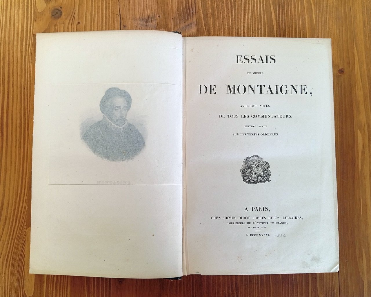 Volume rilegato in mezza pelle verde scuro con titolo in oro al dorso, tagli decorati, 647 pagine; testo in lingua originale francese su due colonne con note a pié di pagina. Bel ritratto inciso dell'autore all'antiporta, protetto da velina. Etichetta di ex libris alla sguardia anteriore, qualche pezzetto di nastro adesivo trasparente agli angoli di copertina, dorso un poco consunto ai margini, paginazione fresca e godibile; nel complesso bell'esemplare di un'edizione non comune, integrale, dei celebri Saggi di Montaigne.