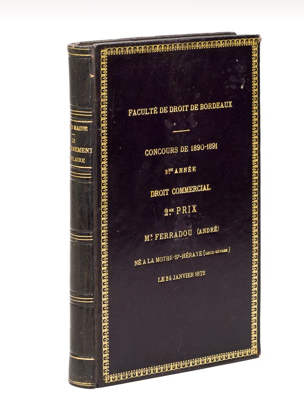 Traduit avec l'autorisation de l'auteur, 1 vol. in-8 reliure de l'époque pleine basane lie-de-vin, super libris en premier plat, fers dorés d'encadrement en plats, Ernest Thorin, Paris, 1887, XX-387 pp. et 2 ff. Précurseur de la sociologie et de l'anthropologie juridique, Sumner Maine (1822-1888) voit ici publié la traduction d'un recueil de 4 essais ("Popular Government : 4 Essays") démontrant l'absence de stabilité particulière de la démocratie par rapport aux autres régimes politiques, ainsi que l'absence de lien entre la démocratie et le progrès. Bon exemplaire de belle provenance, portant au premier plat la mention suivante gravée en lettres d'or : "Faculté de Droit de Bordeaux Concours 1890-1891 3me Année Droit Commercial 2e Prix Mr Ferradou André, né à la Mothe-St-Héraye (Deux-Sèvres) le 24 janvier 1872. Le professeur André Ferradou (1872-1945) fut l'élève de Paul Vigneaux et du spécialiste du droit byzantin Henri Monnier. Sa brillante thèse sur les "Biens des monastères à Byzance" lui ouvrit la voie à un succès à l'agrégation de 1898. Il enseigna à Rennes, Toulouse puis Bordeaux, où il enseigna le droit public pendant plus de 30 ans à la Faculté de Bordeaux, et y approfondit notamment le problème de la féodalité au XVIIIe siècle. Bon état (dos lég. passé et rel. lég. frottée, bon exemplaire par ailleurs) pour cette belle édition à laquelle on joint quelques notes manuscrites (selon toute vraisemblance de la main d'André Ferradou).