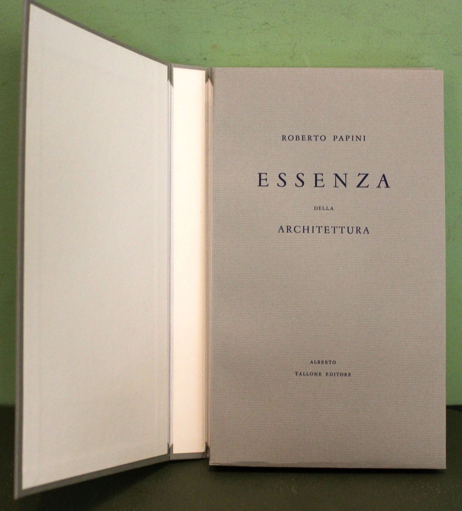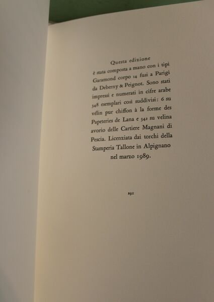 In 8° (mm. 227x132), pp. 129, (9). Brossura editoriale con risvolti. Camicia e custodia editoriale di colore grigio (piccola sgualcitura). Buono stato. Tiratura di 348 esemplari. Copia n. 291 delle 342 su velina avorio delle Cartiere Magnani di Pescia.