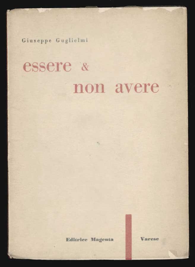 LIBROEdizione originale. Esemplare in ottime condizioni, completo del raro pergamino originale protettivo. Firma di possesso al frontespizio.Riedito da Fermenti nel 2008, «Essere & non avere» di Giuseppe Guglielmi apparve per la prima volta nel 1955 all’interno della collana «Oggetto e simbolo» dell’editore Magenta grazie al sostegno di Luciano Anceschi. Alla sua uscita, Montale firmò un’importante recensione in cui, oltre a sottolineare la chiara influenza dei poeti americani della “terra desolata”, riconosceva la presenza di una poetica fatta di “rotture” più che di “aperture”. Ripresi parzialmente nella successiva raccolta «Panglosse» pubblicata da Feltrinelli nel 1967 e poi in «Ipsometrie» (Savelli, 1980), i componimenti di «Essere & non avere» testimoniano già l’universo di Guglielmi e il suo posizionamento isolato, anche rispetto all’allora nascente neoavanguardia. Non a caso, il suo nome non comparirà nell’antologia «I Novissimi»: nonostante i dubbi iniziali, infatti, Alfredo Giuliani avrebbe infine escluso l’ex compagno di scuola Guglielmi nelle cui liriche sopravvive - contravvenendo a una delle “regole” della poesia novissima indicate dallo stesso Giuliani - un’io lirico per nulla ridotto.