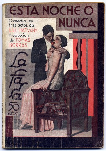 Madrid, La Farsa, 1932. 4to menor; 58 pp. Ilustraciones de Antonio Merlo. Cubiertas originales. La Baronesa Hatvany fue uno de los personajes mas singulares de los treintas. "Tonight or Never", una comedia de gran éxito en el neoyorquino Belasco Theatre, fue llevada al cine por Mervin Le Roy en 1931, producida por Samuel Goldwyn e interpretada por Gloria Swanson, con trajes de Coco Chanel. El Baron Ferenc Hatvany (1881-1951) de orígen judío, fue además de un excelente pintor, uno de los mejores coleccionistas de su tiempo. Su coleccción fue saqueada tanto por los nazis como por los rusos. Murió en Paris.