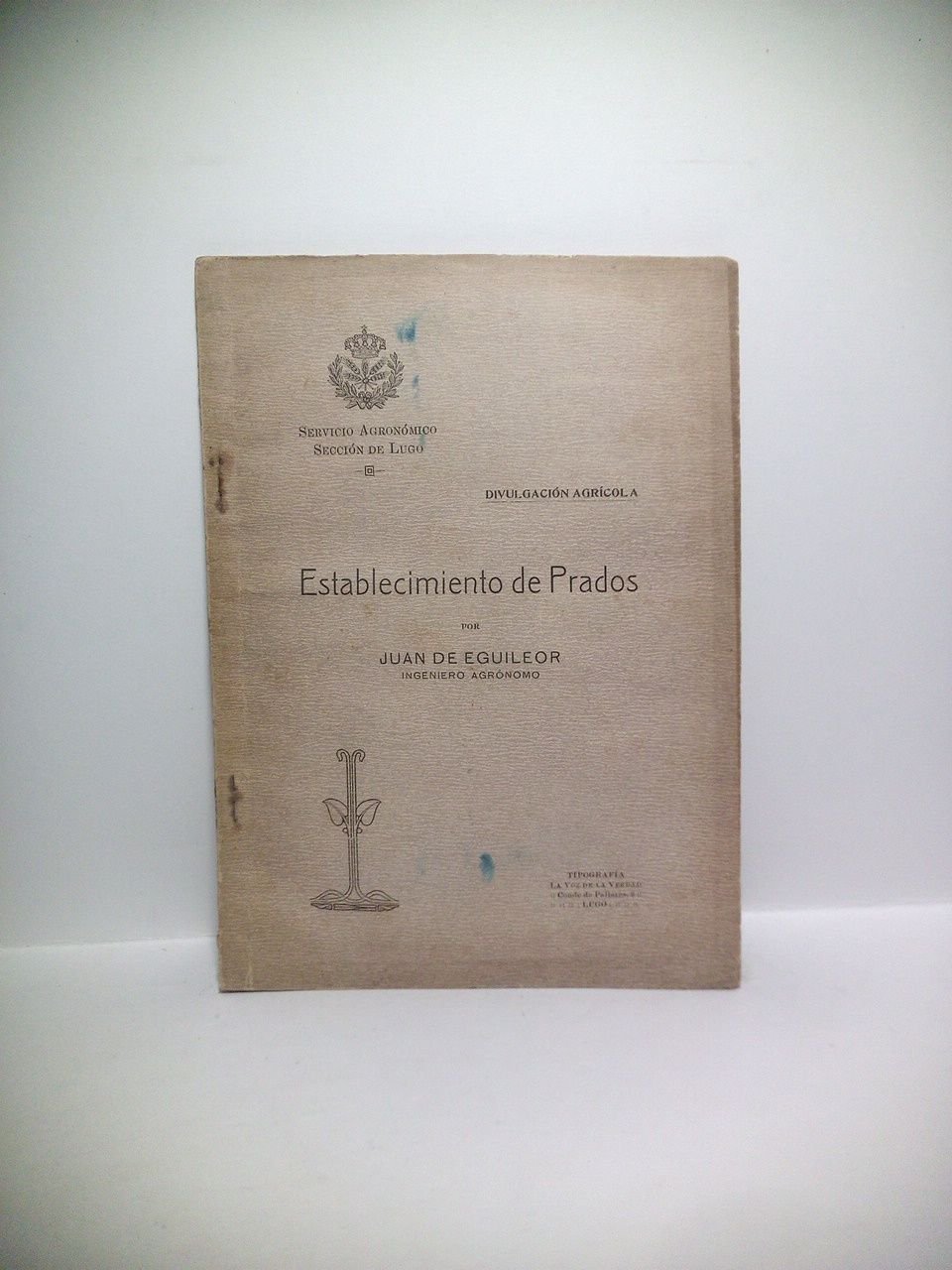 Lugo: [Edita] Servicio Agronómico (Tip. La Voz de la Verdad), [ca. 1917].- 71 p., [1 h.]: Estados; 4º menor (21,5 x 15,6 cm); Rústica Ed.- (Servicio Agronómico, Sección de Lugo. Divulgación Agrícola.* ECONOMÍA AGRARIA, AGRARISMO, MONTES, GANADERÍA E INDUSTRIA PESQUERA