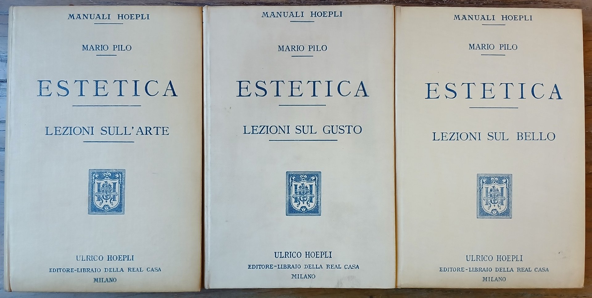Tre volumi in 16° grande, legature editoriali in piena tela avorio con titoli impressi ai dorsi ed ai piatti anteriori, tagli in colore rosso. "Lezioni sul bello", 1905, pp. XXIII,(1),257,(3) + pp. 64 di Elenco Manuali Hoepli. "Lezioni sul gusto", 1906, pp. XIII,(3),255,(1) + pp. 64 di Elenco Manuali Hoepli, piccolo ex libris al risguardo anteriore. "Lezioni sull'arte", 1907, pp. XIV,(1),286,(2) + pp. 64 di Elenco Manuali Hoepli. Prime edizioni. I tre volumi delle "Lezioni" compongono il corso di estetica tenuto dal Prof. Mario Pilo all'Università di Bologna nell'anno accademico 1900-1901. Primo e terzo volume con poche e circoscritte sottolineature a matita, facilmente removibili, peraltro ottimo stato di conservazione.