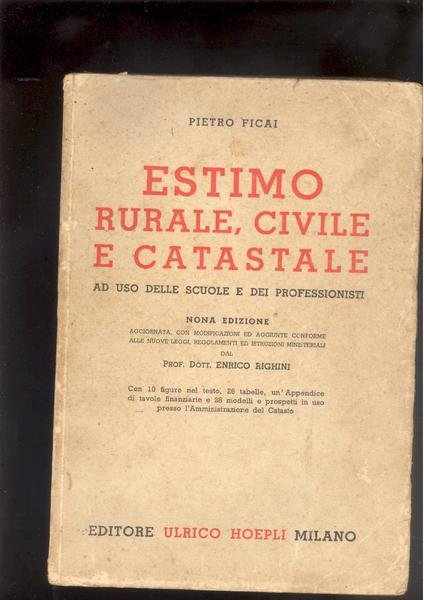 IN 8° ( cm.25 X 18 ), pp.399, CON 10 fig. NEL TESTO, 26 TABELLE, UN'APPENDICE DI TAVV.<BR>FINANZIARIE E 28 MODELLI E PROSPETTI IN USO PRESSO L'AMMINISTRAZIONE DEL CATASTO. E' LA NONA EDIZIONE AGGIORNATA E MODIFICATA DAL PROF. DOTT. ENRICO RIGHINI. OTTIMA CONSERVAZIONE.ID 1133