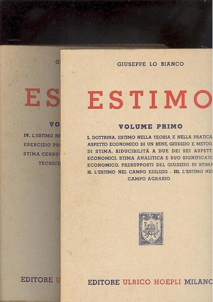 DUE VOLL. IN 8° ( cm.25 X 18 ), PER COMPLESSIVE pp.300. IL PRIMO VOL. CONTIENE:<BR>I) DOTTRINA,ESTIMO NELLA TEORIA E NELLA PRATICA,ASPETTO ECONOMICO DI UN BENE,GIUDIZIO E METODI DI STIMA,RIDUCIBILITA' A DUE DEI SEI ASPETTI ECONOMICI,<BR>STIMA ANALITICA E SUO SIGNIFICATO ECONOMICO,PRESUPPOSTI DEL GIUDIZIO DI STIMA .<BR>II) L'ESTIMO NEL CAMPO EDILIZIO. III) L'ESTIMO NEL CAMPO AGRARIO. IL SECONDO VOL.<BR>CONTIENE: IV) L'ESTIMO NEL CAMPO LEGALE.V) L'ESTIMO NELL'ESERCIZIO PROFESSIONALE.VI) I CATASTI E LA STIMA CENSUARIA. VII) ESEMPI DI CONSULENZE TECNICHE NEL CAMPO ESTIMATIVO. DUE VOLL. IN OTTIMA CONSERVAZIONE. ID 1134