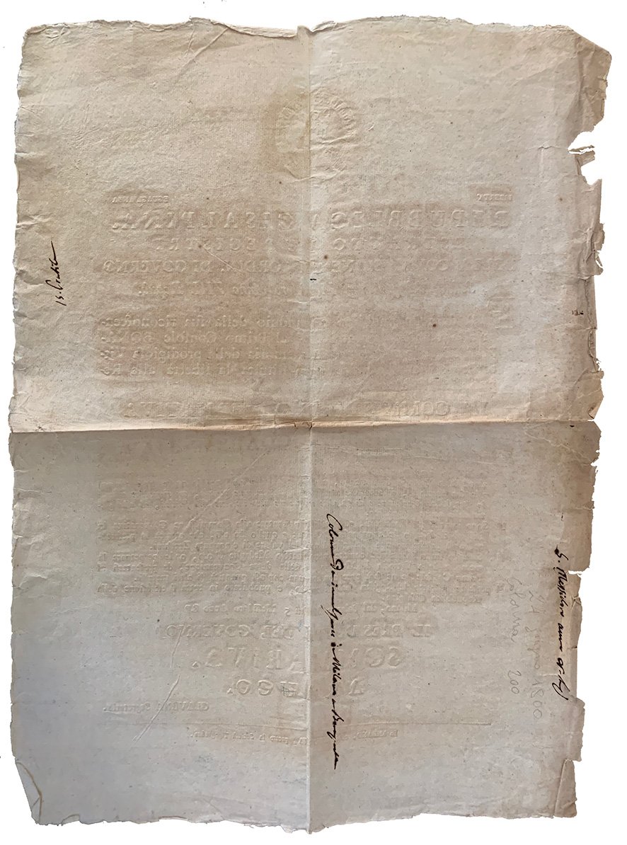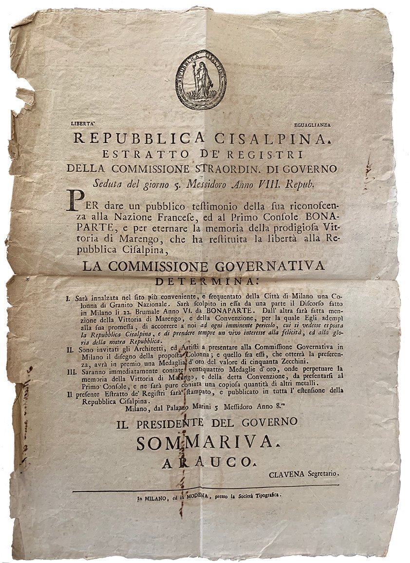 Foglio volante di mm 485x360 recante in alto lo stemma della Repubblica Cisalpina. Lievemente brunito, tracce di piegatura.Raro avviso promosso dal governo della Repubblica Cisalpina relativo all'innalzamento di una colonna di granito e al conio di ventiquattro medaglie d'oro per celebrare la vittoria napoleonica di Marengo (14 giugno 1800). Il bando era stato fatto stampare in tutto il territorio della Repubblica per invitare architetti e scultori a presentare i loro progetti. Il vincitore avrebbe ottenuto in premio una medaglia del valore di cinquanta zecchini. La colonna apparentemente non fu mai realizzata.