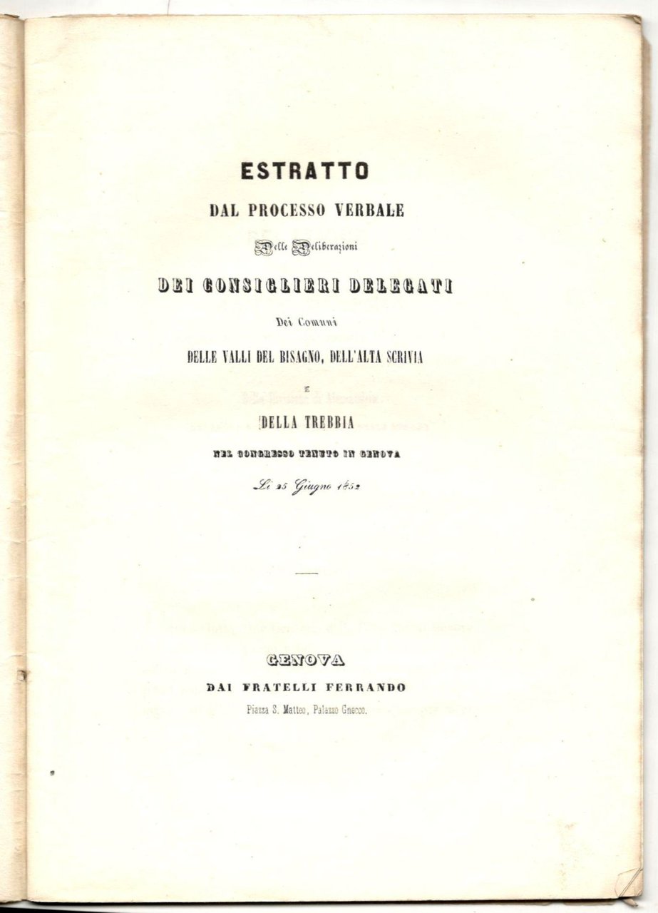 Estratto del processo verbale delle deliberazioni dei consiglieri delegati dei comuni delle valli del Bisagno, dell'alta Scrivia e della Trebbia nel congresso tenuto in Genova Li 25 giugno 1852