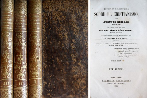 Barcelona, Librería Religiosa, Imprenta de Pablo Riera, 1854. Tres tomos en 4to. mayor; 500 pp. + 552 pp. + 408 pp. Encuadernación de la época en piel marbreada.