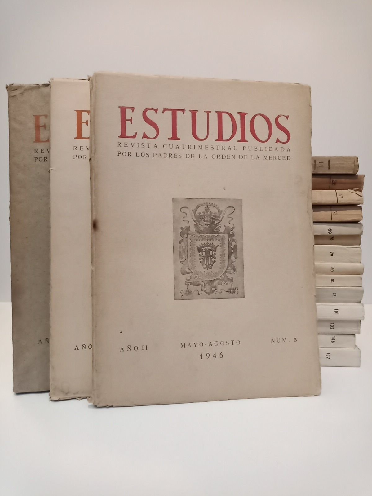 Madrid: Orden de la Merced, 1946-1974.- Diversos números de unas 180 páginas aproximadamente, en numeración continua para cada año, los primeros cuatrimestrales y el resto trimestrales; 4º (24 x 17 cm.); Cartulina Ed.- Ofrecemos los siguientes números sueltos: 5 (mayo-agosto 1946), 6 (septiembre-diciembre 1946), 10 (enero-abril 1948), 11 (mayo-agosto 1948), 26 (mayo-agosto 1953), 47 (octubre-diciembre 1959), 52 (enero-marzo 1961), 69 (abril-junio 1965), 78 (julio-septiembre 1967), 79 (octubre-diciembre 1967), 80 (enero-marzo 1968), 81 (abril-junio 1968), 83 (octubre-diciembre 1968), 101 (abril-junio 1973), 102 (julio-septiembre 1973), 106 (julio-septiembre 1974) y 107 (octubre-diciembre 1974). SE VENDEN SUELTOS, cada uno al precio indicado.* El número 26 tiene una pequeña falta al pie del lomo, por lo demás las revistas se encuentran en buen estado de conservación. Publicación creada en 1945 por el joven Provincial de Castilla, P. José M.ª Vallejo Álvarez, Estudios trata cuestiones sobre filosofía, historia, literatura y cultura general desde una perspectiva religiosa, aunque con el tiempo fue adquiriendo un tomo más generalista. FILOSOFÍA E HISTORIA DE LA CULTURA