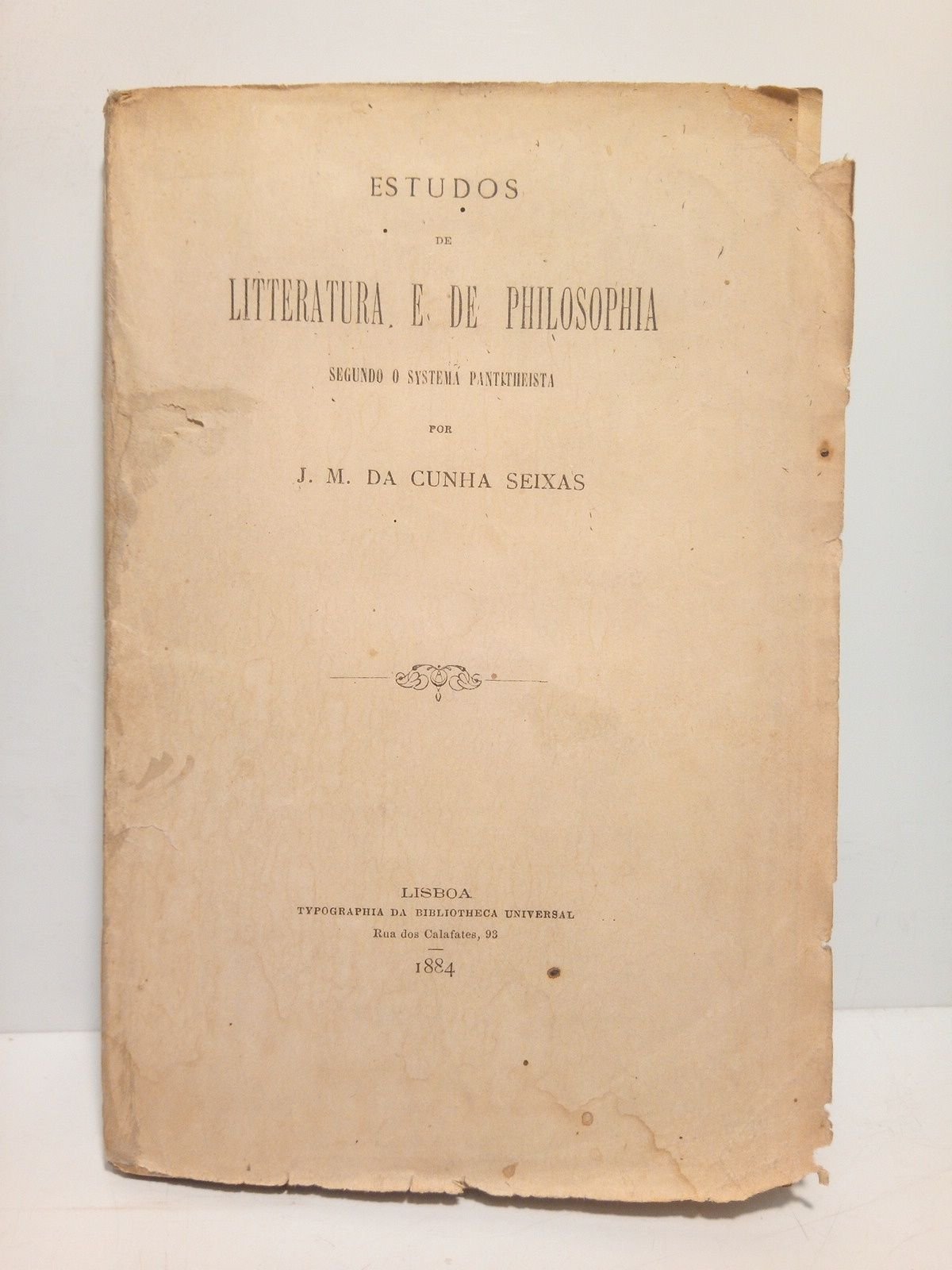 PRIMERA EDICION.- Lisboa: Tip. da Bibliotheca Universal, 1884.- 215 p.: Retrato xilográfico del autor ante la portada; 8º mayor (20 x 13,6 cm); Texto en portugués; Rústica Ed.- RARO.* Cubiertas fatigadas, con tenues manchas y pequeñas faltas en sus esquinas. Interior en muy buen estado. PORTUGAL