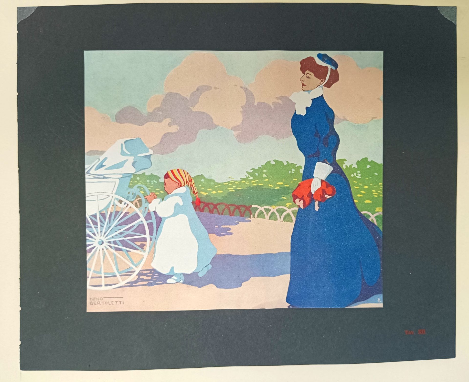 La stampa si intitola “L'età dorata” e rappresenta un fanciullo che impara a camminare spingendo la carrozzina e la mamma che lo segue, tenendo in mano la sua bambola. Esemplare in ottime condizioni, montato su cartoncino nero originale, su cio è impresso in basso a sinistra "TAV. XII".