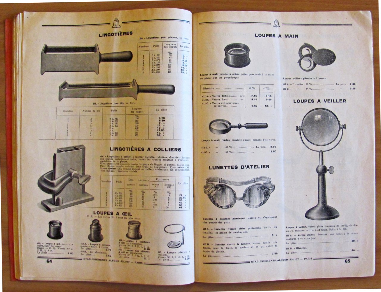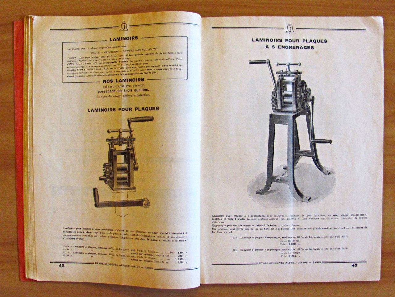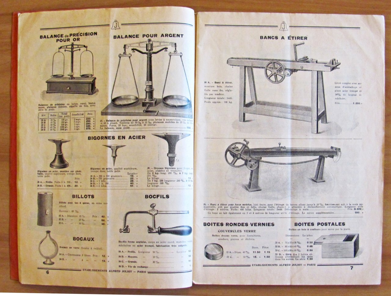 Utensileria, attrezzature, macchinari e bilance. Illustrazioni in b/n n.t. degli articoli. Ed. Alfred Joliot - Paris, 1925 Brossura editoriale con qualche segno a penna alle copertine. Piccolo taglietto al margine basso del frontespizio e bruniture del tempo alla prima e all'ultima pagina. Peraltro in Ottimo stato. 18,5x26; pp.112. RARO e in BUONISSIMO STATO , Molto buono (Very Good)