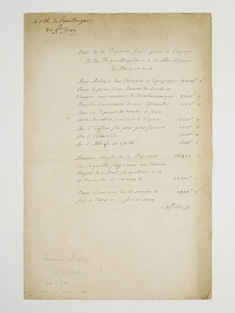 AUTOGRAFODocumento autografo originale.CON AUTOGRAFO.Ottimo esemplare (minima brunitura ai margini).Straordinario documento relativo alla misurazione del cosiddetto meridiano di Parigi, considerato il meridiano zero per oltre duecento anni, punto di riferimento per ogni cartografo fino al 1884, quando venne sostituito dal meridiano di Greenwich, non senza aspre polemiche che opposero Francia e Inghilterra. -- Nel 1666 re Luigi XIV aveva fatto costruire nei pressi dell’abbazia di Port-Royal un grande osservatorio astronomico, al cui interno passava una linea retta, disegnata sul terreno, che attraversava idealmente tutta la Francia, da Dunquerque a Perpignan: il meridiano di Parigi appunto. Il primo tentativo di misurazione del meridiano si deve al celeberrimo astronomo italiano naturalizzato francese Jean-Dominique Cassini, che però dovette interrompere i lavori nel 1701. Le sue ricerche furono riprese dal figlio Jacques (Cassini II), che succedette al padre come membro della prestigiosissima Académie des Sciences e fece parte della Royal Society (1696), divenendo amico di Isac Newton: «En 1718, Jacques Cassini, accompagné de son cousin Giacomo Filipo Maraldi (1665-1729) et de Gabriel-Philippe de La Hire (1677-1719), vient d’achever le prolongement du relevé géodésique de la méridienne de France, du Sud au Nord du royaume, que son père avait dû interrompre en 1701. Ce vaste projet, dont le but ultime est l’établissement de la carte de France, donne lieu à une importante publication (“Traité de la grandeur et de la figure de la Tere”, Amsterdam, 1723), dans laquelle Jacques Cassini établit également la forme ovoïde de la Terre, c’est-à-dire allongée vers les pôles. C’est l’aboutissement de plusieurs décennies d’efforts initiés par l’abbé Jean Picard, durant lesquelles la science de la géodésie est fondée. Grâce à ce travail titanesque, Jacques Cassini, proche de la cinquantaine, a acquis une autorité respectée auprès de ses collègues de l’Académie royale des sciences» (Descamps, «La ligne méridienne», online). -- I grandi risultati ottenuti lo spronarono a ulteriori ricerche: come testimonia il preziosissimo documento che qui presentiamo, nel 1738 intraprese un nuovo viaggio per studiare il meridiano di Parigi. Si tratta di un preciso rendiconto delle spese sostenute per la missione, finanziata dal Thresor Royal con 24000 livres: «Pour Achapt des Chevaux et Equipage 4219 / Pour le prix d’un Quart de Corde et d’autres instruments de Mathematique 2355 / Pour a Construction de sept Pyramides 1762 / Pour la Depense de bouche et frais extraordinaires pendant le Vouage 15250 / Au S. Cassini fils pour gratification 1200 / Au S. Maraldi 1200 / Au S. Abbé de la Caille 1000 [.] / Donc il me reste du[sic] la somme de 2986 / faite a Paris ce fevrier 1739. Cassini». -- Il documento risulta tanto più importante perché, di fatto, sancisce il passaggio di testimone da Cassini II a Cassini III, vale a dire a César-François Cassini de Thury, citato qui come «S. Cassini fils»: sarà lui, solo un anno dopo, nel 1740, a stabilire con precisione la misura del meridiano di Parigi, portando a termine i lavori del padre e del nonno. -- Ma altri due personaggi di grande rilievo compaiono nel rendiconto come compagni di viaggio di Jacques Cassini: il primo è il «S. Maraldi», cioè Giovanni Domenico Maraldi, nipote di Giacomo Filippo Maraldi, entrambi nomi eminentissimi nell’astronomia. Il secondo è «S. Abbé de la Caille»: stretto collaboratore di Jacques Cassini, importantissimo astronomo francese, redasse un fondamentale catalogo di oltre diecimila stelle del cielo australe, pubblicato solo postumo. -- Un’ultima parola va dedicata al destinatario del documento: in testa al primo foglio si legge infatti l’indicazione «a M. de Boullogne / 20 fevr 1739», vergata da una mano differente rispetto a quella di Cassini. Non è stato possibile risalire con precisione all’identità del personaggio in questione, ma potrebbe trattarsi di Jean de Boullongne, personaggio di primo piano nell’amministrazione francese, nominato nel 1711 consigliere del re e tesoriere dell’'Hôtel de Ville, per poi divenire “Intendant des finances” e “Contrôleur général des finances” tra il 1757 e il 1759.P. Descamps, «La ligne méridienne de l'Observatoire de Paris: Une analyse des registres des observations de Cassini II de 1730 à 1755», in «Revue d'histoire des sciences», 2014/1 (Tome 67), pp. 35-70 (online); M. Pelletier, «Science et cartographie au Siècle des lumières», in «Cartographie de la France et du monde de la Renaissance au Siècle des lumières», Paris, Éditions de la Bibliothèque nationale de France, 2002, pp. 69-105 (online).