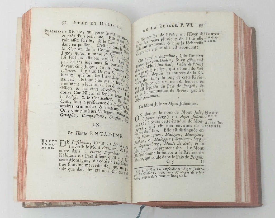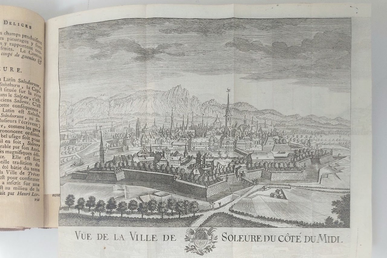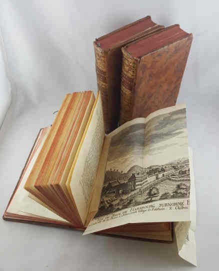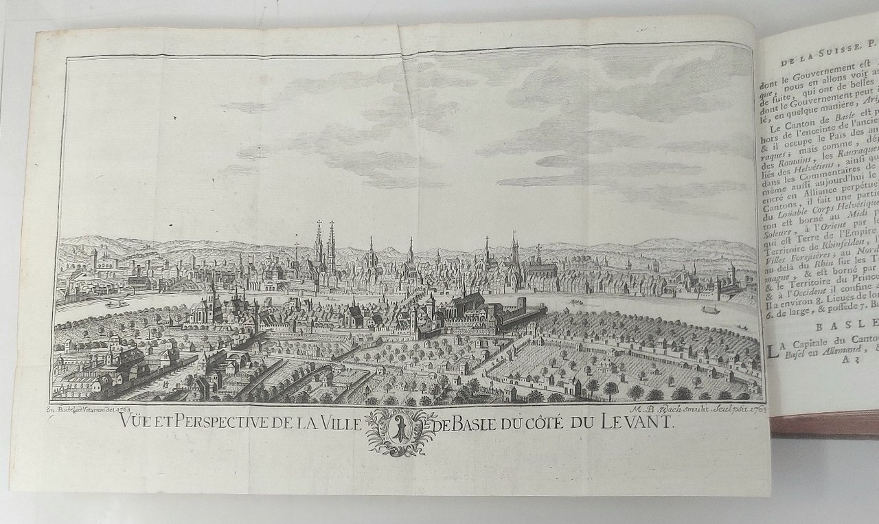 >4 vol. in-12 (mm 165x95), pp. (6), 432; (6), 444; (2), XXIV, (4), 350; (6), 422, (2); legatura del tempo pieno vitello marmorizzato, titolo e ricchi fregi oro ai dorsi, tagli rossi (piccoli difetti alle cuffie). Con una grande carta geografica e complessive 36 splendide tavole ripiegate f.t., per lo più disegnate da Em. Buchel ed incise in rame da M.B. Wachsmuth; esse raffigurano montagne e ghiacciai, fossili, rocce e cristalli, reperti archeologici, località termali, paesi e città (Zurigo, Berna, Lucerna, Basilea, Altdorf, Schwitz, Einsidlen, Coira, Schafhouse e la nota cascata, ecc.). Edizione notevolmente ampliata (la prima fu 1730) di quest'opera che tratta ogni aspetto naturalistico, sociale ed umano della Svizzera agli inizi del XVIII secolo. Curioso l'errore nel titolo del I vol.: ''helvétique'' in luogo di ''historique''. Bell'esemplare Perret 3814, note. Lonchamp, Bibl. Gén., 2560. ACL 265.