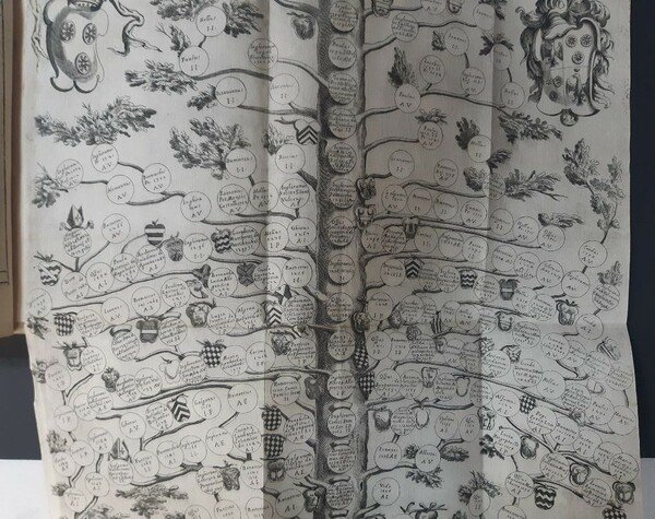 In-folio, plein parchemin cr�me, dos � nerfs, titre � l�encre, (18) pp. de pi�ces limin., 324 pp. Illustr� d�un grand tableau g�n�alogique, 2 plans repli�s et 2 planches en taille douce. Nombreuses figures sur cuivre et sur bois dans le texte. Soigneuse restauration marginale du faux-titre. Signature autographe au bas du titre : �Francisci Xaverii Guicciardi, Roma 1707�. Humidit� angulaire � 9 ff. liminaires, infime par ailleurs. Reliure un peu d�r�gl�e.