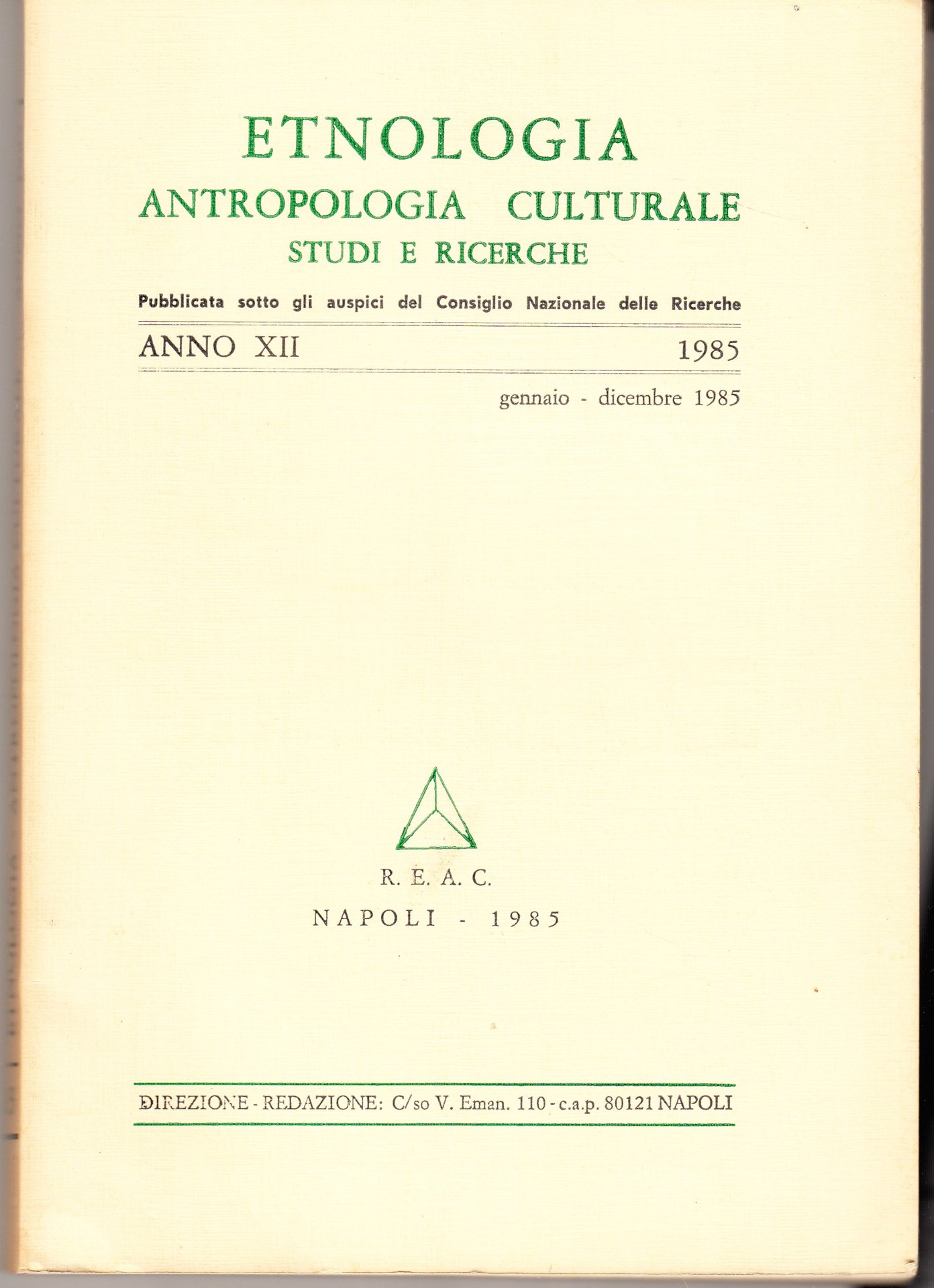 Etnologia Antropologia Culturale. Studi e Ricerche (già Rivista di Etnografia - Anno XXXIII dalla fondazione). Pubblicata sotto gli auspici del Consiglio Nazionale delle Ricerche. Vol.XII Anno 1985 gennaio - dicembre 1985