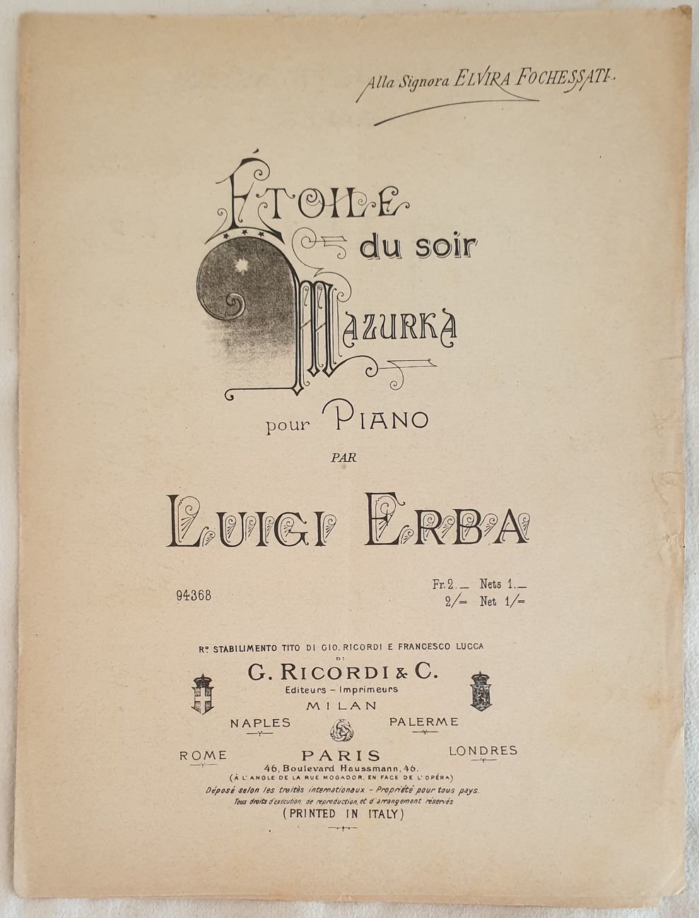 Edizione Ricordi di questo spartito per pianoforte del pezzo "Etoile du soir" mazurka per pianoforte del compositore Luigi Erba. Senza data ma della fine ottocento inizi novecento. Dedicato alla Sig.ra Elvira Fochessati. Ottime condizioni, qualche fioritura. qualche piccolo strappo marginale. In folio. cm 32,5x24,5. pp. (4). Ricordi edition of this musical score for piano "Etoile du soir" mazurka for piano by the composer Luigi Erba. Not dated but of late 19th century or early 20th. Dedicated to Mrs Elvira Fochessati. Very good conditions, some foxings. Some little tear in the edges. In folio. cm 32,5x24,5. pp. (4).