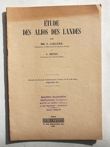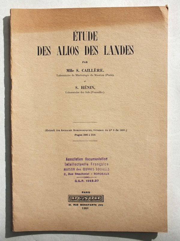 Extrait des Annales Agronomiques, 1 brochure in-8, Dunod, Paris, 1951, 21 pp. Bon état. Stéphane Hénin était un agronome, pédologue et. docteur en philosophie des sciences ("Essai sur la méthode en agronomie", 1944). Après la guerre, devenu professeur au Muséum d'histoire naturelle, il travailla avec Simone Caillière sur les argiles et les grès (l'Alios des Landes est un grès, présent à faible profondeur sous le sable des Landes. L'épaisseur ce la couche d'alios est généralement entre 20 et 120 cm).