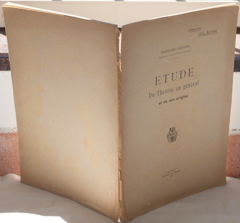 In 4. Dim. 29x21 cm. Pp. 53. Interessante pubblicazione del 1896, uno studio sul teatro in generale di Ferruccio Padovani, professore all'Istituto tecnico di Spoleto. Copia omaggio dell'autore. Lingua francese In buone condizioni, pagine ancora unite fra loro. Copertina editoriale in buone condizioni generali con lievi usure e parti mancanti ai margini e dorso. Piatti in parte staccati. Legatura in discrete condizioni con rotture. All'interno le pagine si presentano in ottime condizioni con rare fioriture, ancora unite fra loro. Interesting pamphlet of 1896, a study about the theatre in general by Ferruccio Padovani, teacher in the technical institute of Spoleto. Copy gift of the author. French language. In good conditions, pages still bound together. Editorial cover in good general conditions slightly worn with missing parts in the edges and spine. Plates partially detached. Binding in fair conditions with cracks. Inside pages are in very good conditions with occasional foxings, still bound together.