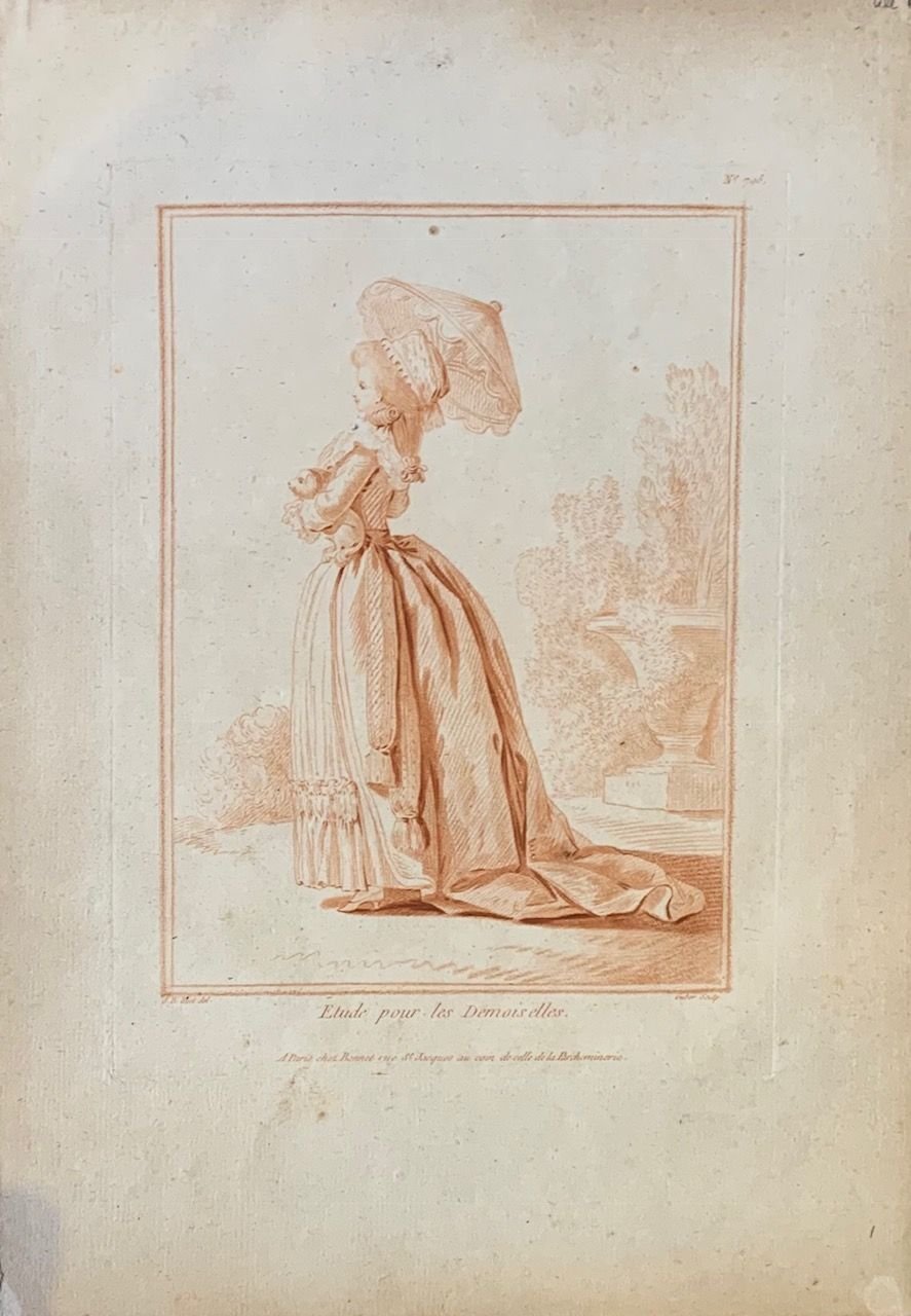 >Incisione in rame in sanguigna (255x185 mm e 5 cm di margine per lato), incisa da Guber dal disegno di J.B. Huet: fanciulla con ombrellino parasole e cagnolino in braccio. Delicato soggetto di moda femminile settecentesca, realizzato "à la manière du lavis": particolare tecnica di incisione che tendeva a riprodurre il più fedelmente possibile l'effetto del disegno in sanguigna. Buono stato.