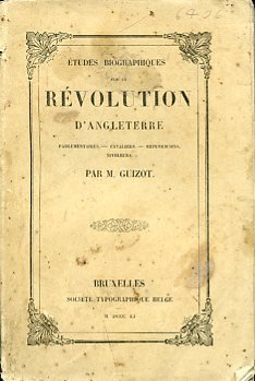 In-16°, pp. 317, (3), brossura editoriale con titolo entro bordura. Fioriture e gore alla brossura, ma esemplare parzialmente intonso ed in buono stato. Prima edizione belga, contemporanea all'edizione originale del Didier di Parigi, di questa importante raccolta di biografie dei massimi personaggi della Rivoluzione inglese e della vita politica in Inghilterra nella seconda metà del Seicento, concepita a complemento dell'Histoire de la Révolution d'Angleterre'. Tra i personaggi studiati, il Duca di Buckingham, Carlo I, Giacomo II. Francois-Pierre-Guillaume Guizot (Nimes, 1787-Val Richer, Lisieux, Calvados, 1874) fu tra i masssimi storici e statisti francesi del secolo XIX. Autore di molte celebri opere sulle rivoluzioni di Francia e Inghilterra, fu in politica un monarchico costituzionale su posizioni non lontane da quelle del suo amico Royer Collard e ricoprì il Ministero dell'Istruzione sotto Luigi Filippo, introducendo un nuovo sistema per l'educazione primaria, e, nel 1847, la carica di Primo Ministro. 'His leadership provided a stable government, but his complacent acceptance of the established order led to his overthrow in the February Revolution of 1848, which forced the abdication of Louis Philippe. Guizot devoted the rest of his life to writing. The best known of his many works, Histoire de la révolution d'Angleterre [history of the revolution in England] (6 vol., 1826-56), illustrates his critical approach and his devotion to original sources as well as his admiration for middle-of-the-road British revolutionism. He also wrote Mémoires pour servir à l'histoire de mon temps and the brilliant General History of Civilization in Modern Europe (6 vol., 1829-32; tr. by William Hazlitt, 3 vol., 1846). The last work, never completed, covers principally the civilization of France up to the 14th century' (Columbia Electronic Encyclopedia). Le sue ricerche storiche risentono ancora della grande storiografia dell'età dell'Illuminismo e risultano ancora documentate ed acute malgrado la loro arretratezza rispetto alle correnti della storiografia sua contemporanea.